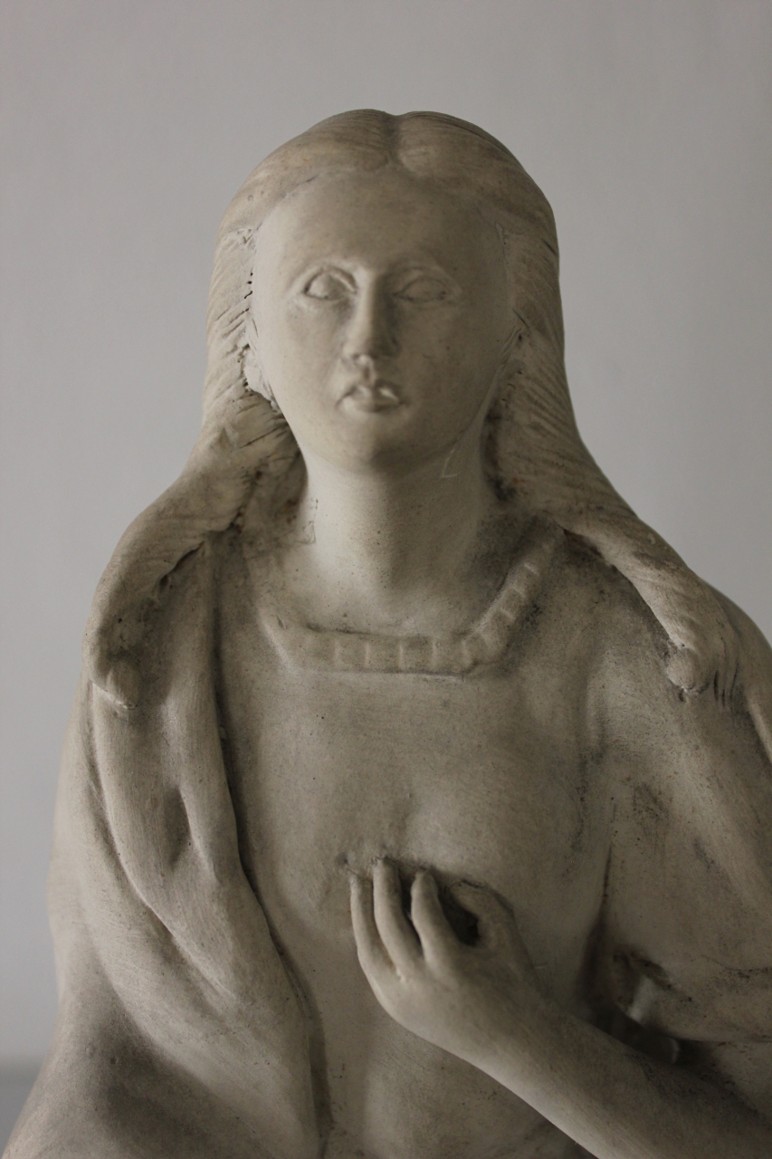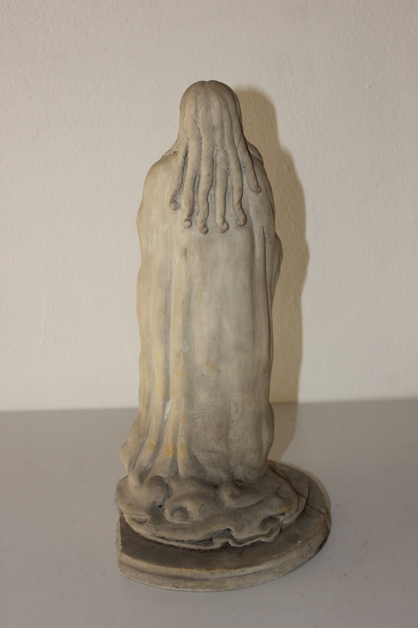 Scultura in biscotto raffigurante una figura femminile in posizione eretta con capigliatura fluente a boccoli ricadente sulle spalle coperte da un ampio mantello che scende fino a toccare terra. La mano sinistra è accostata al petto