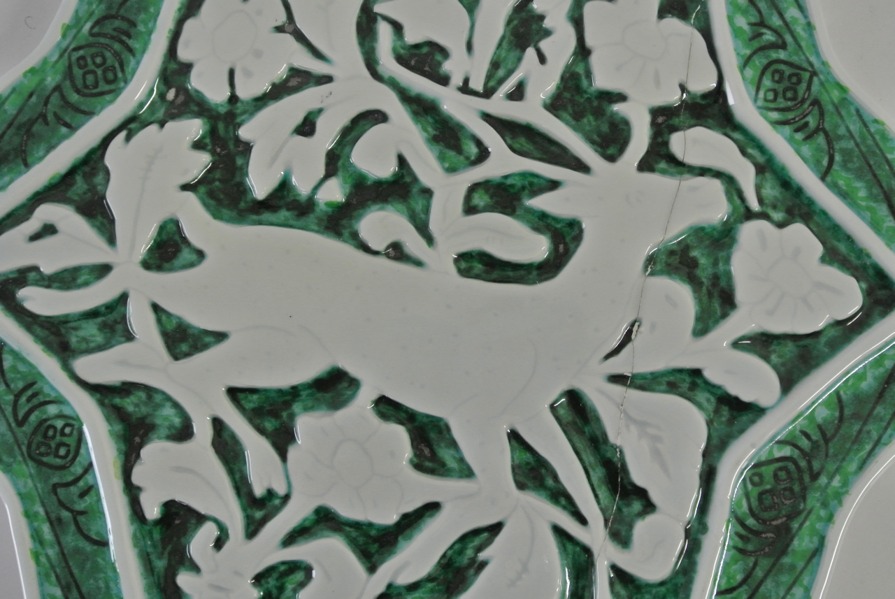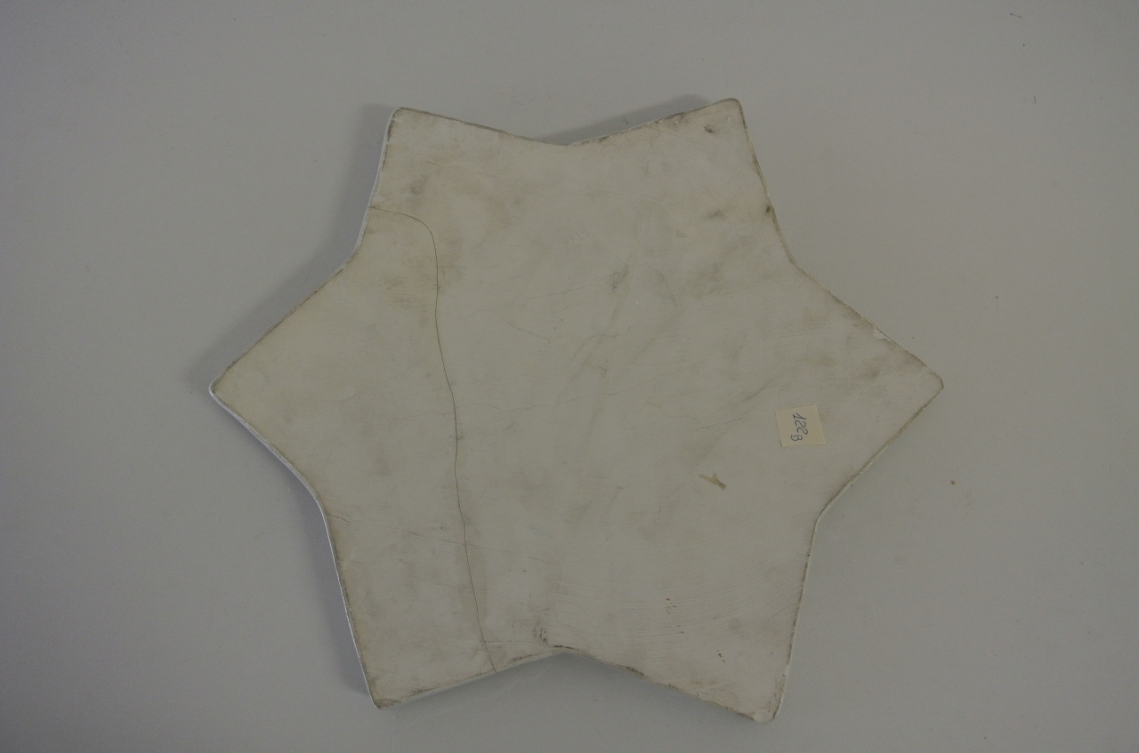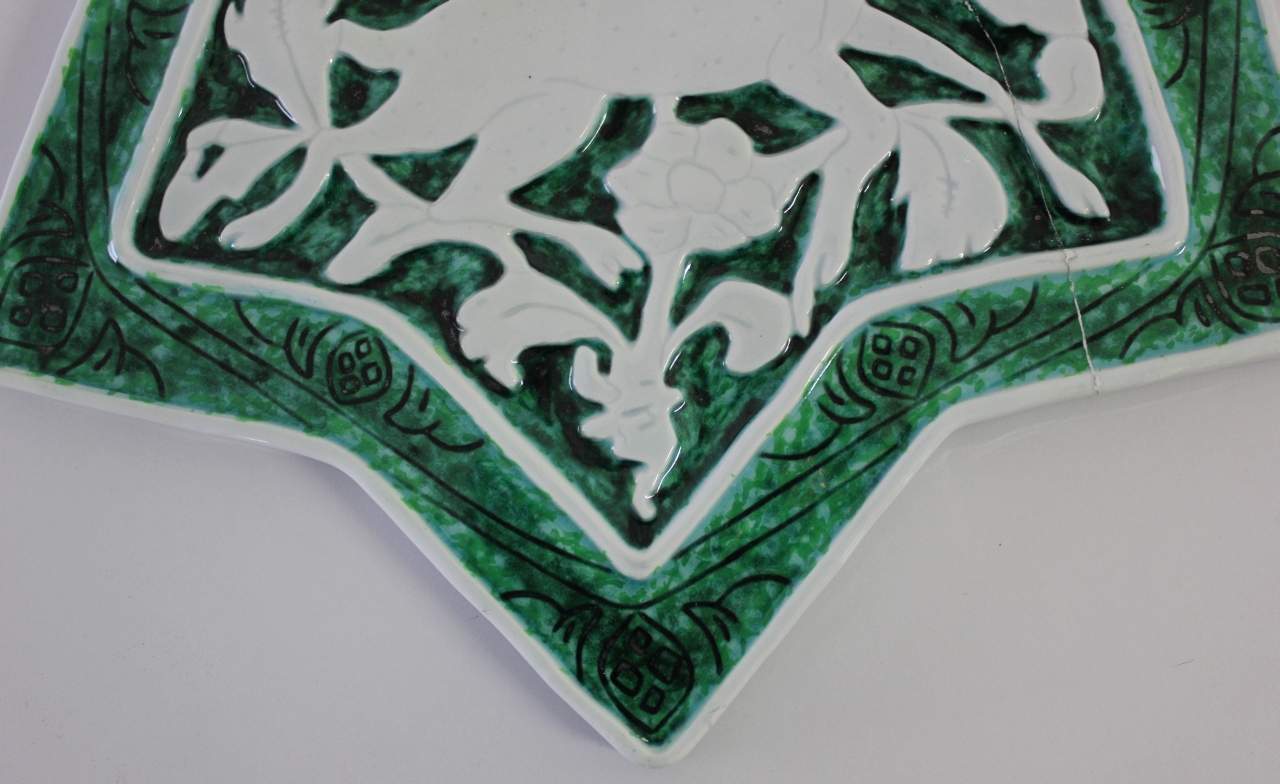 Mattonella in ceramica smaltata a forma di stella a sei punte. Nel mezzo è rappresentato un cervo e motivi vegetali a rilievo bianco su sfondo verde ramina. Il soggetto di derivazione persiana è inscritto entro una cornice di forma stellare