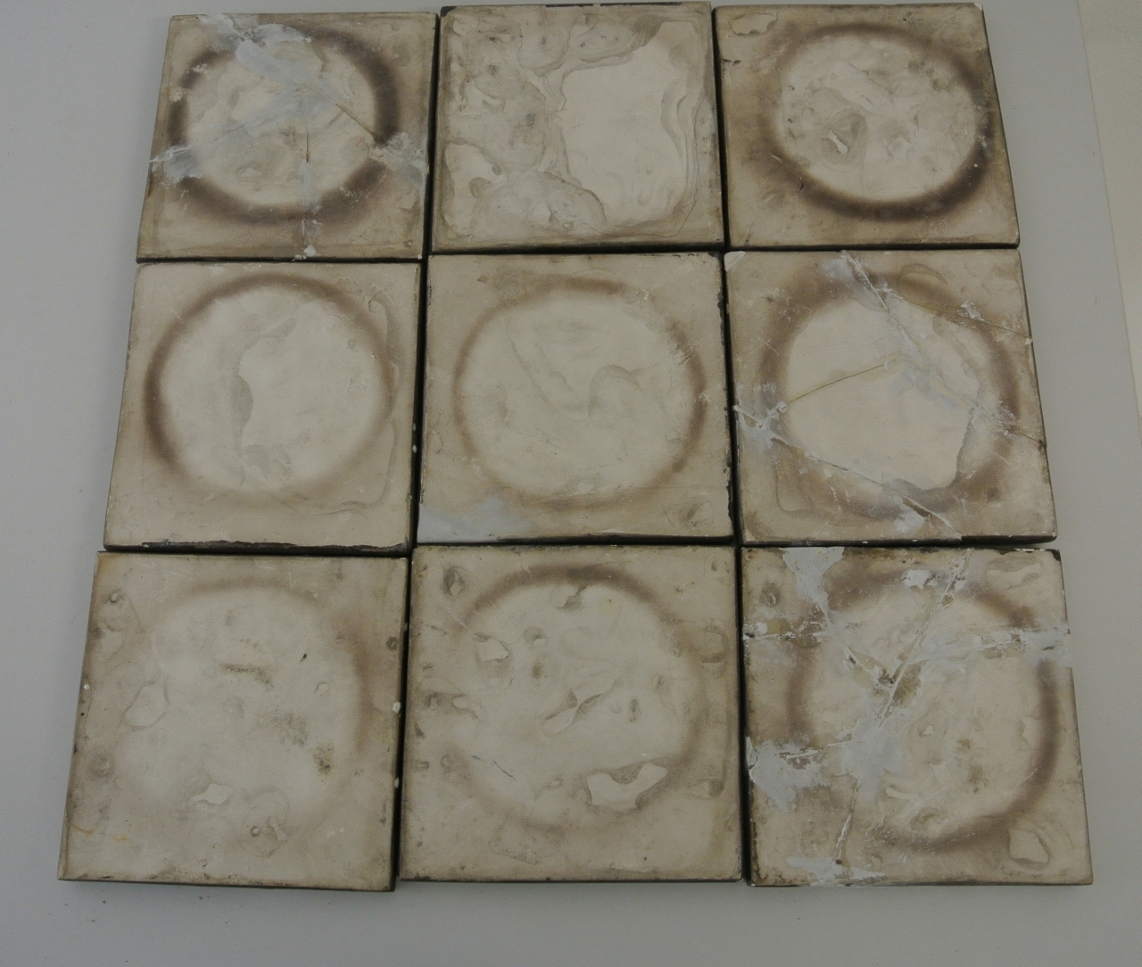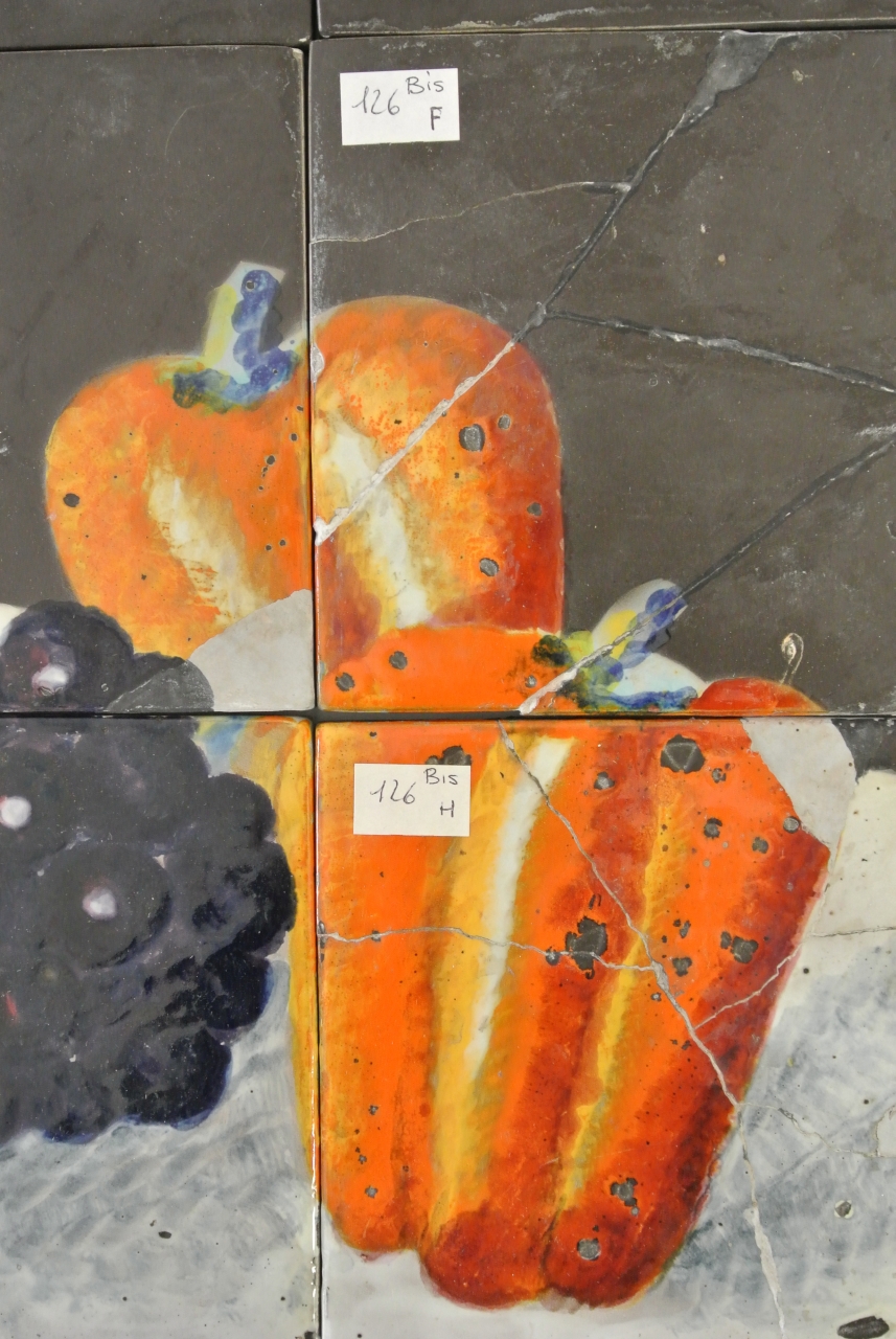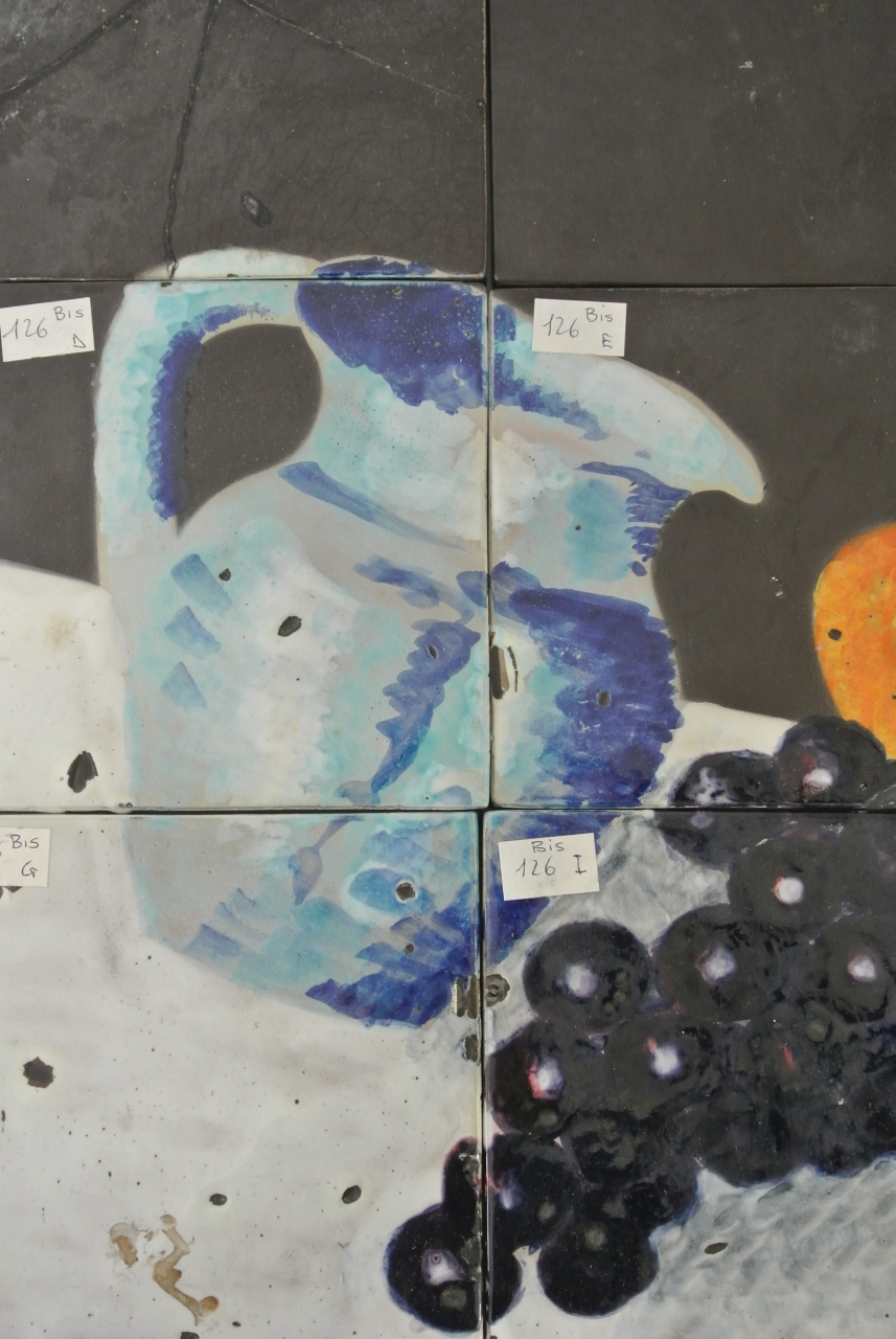 Pannello in ceramica con natura morta formato da nove piastrelle. Su fondo nero si staglia un tavolo bianco con brocca blu e celeste, grappolo d'uva e peperoni rossi