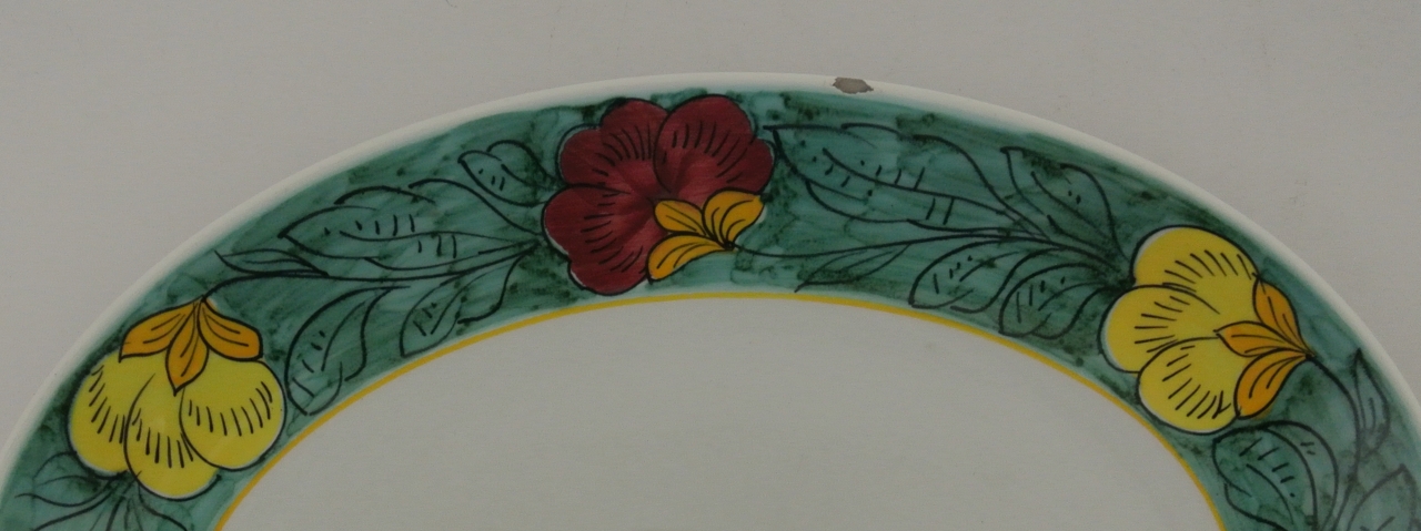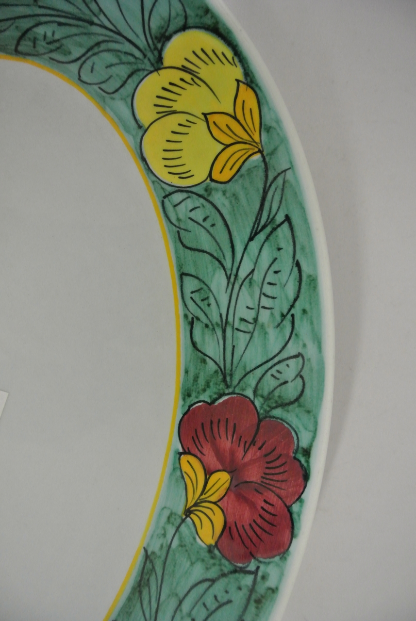 Piatto ovale a fondo bianco decorato con ala a fondo verde ramina e fascia a fiori giallo-rossi, foglie filettate in nero