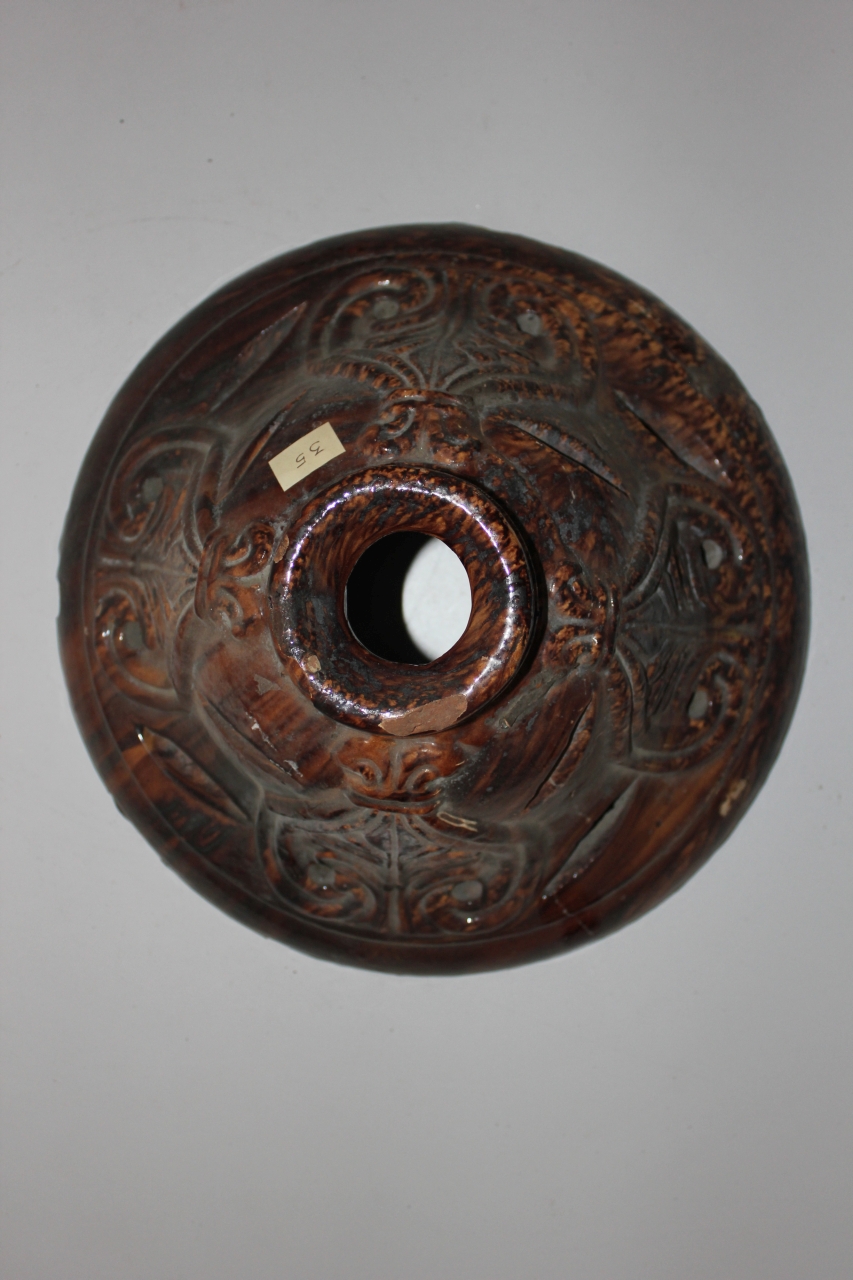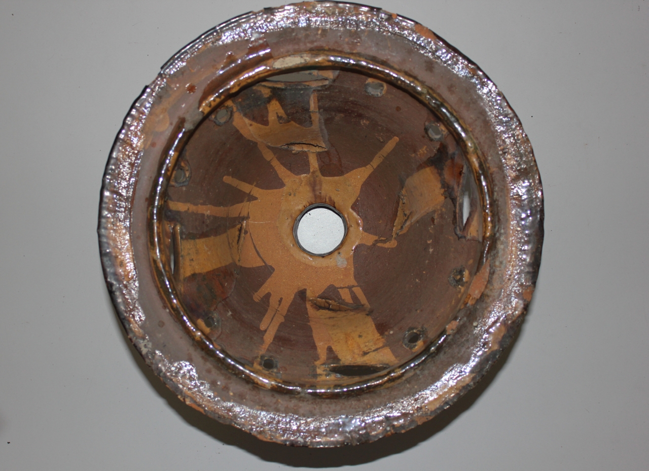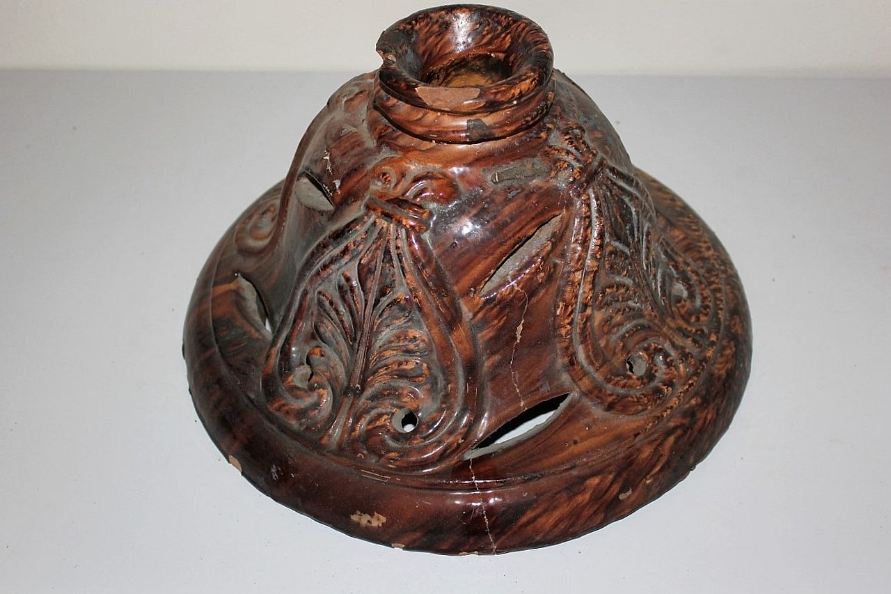 Coperchio di bracere in terracotta smaltata con colature marroni. Decori a palmette entro scudi a volumi. Fori per la fuoriscita del calore