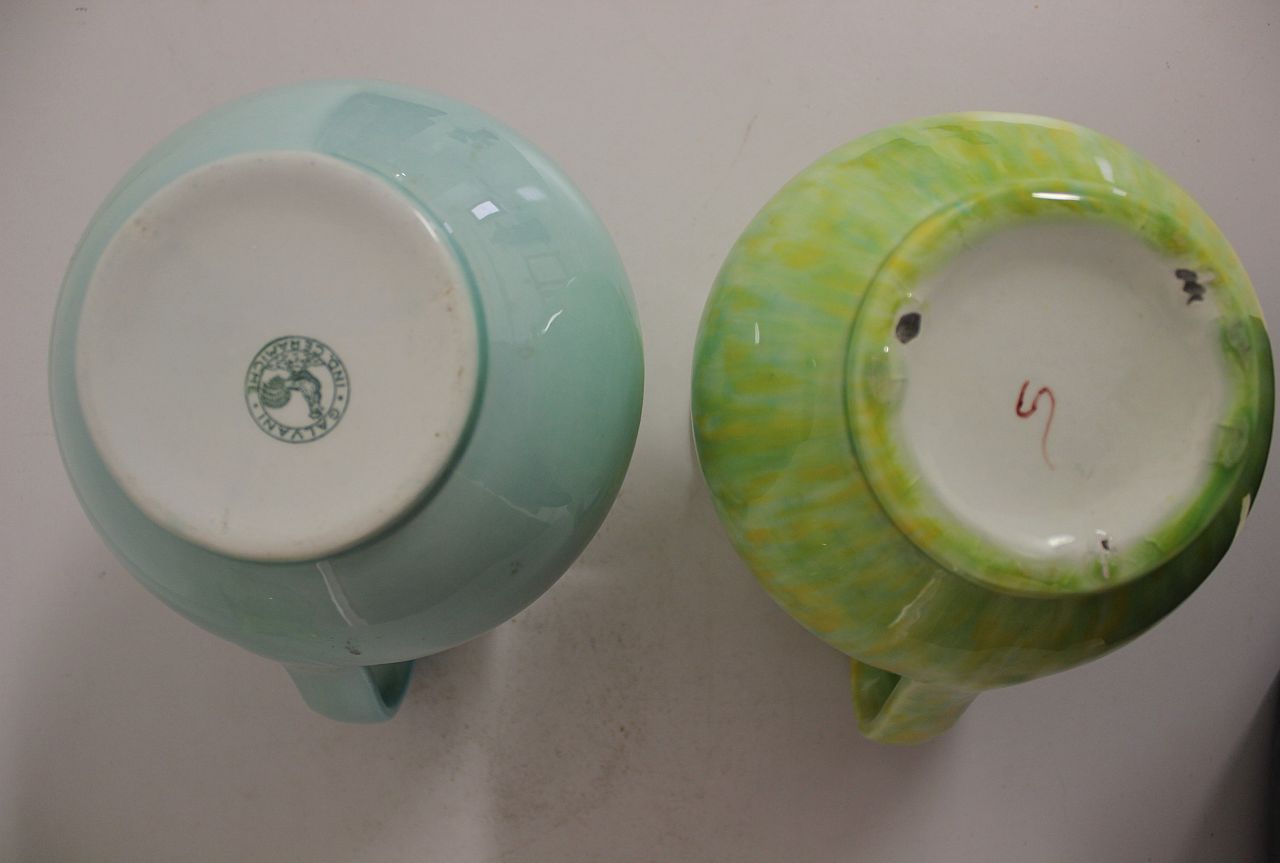 Serie di tre boccali con colori marmorizzati e colature, nel seguente ordine: "H" e "M" di colore verde e giallo; "G" monocolore verdino