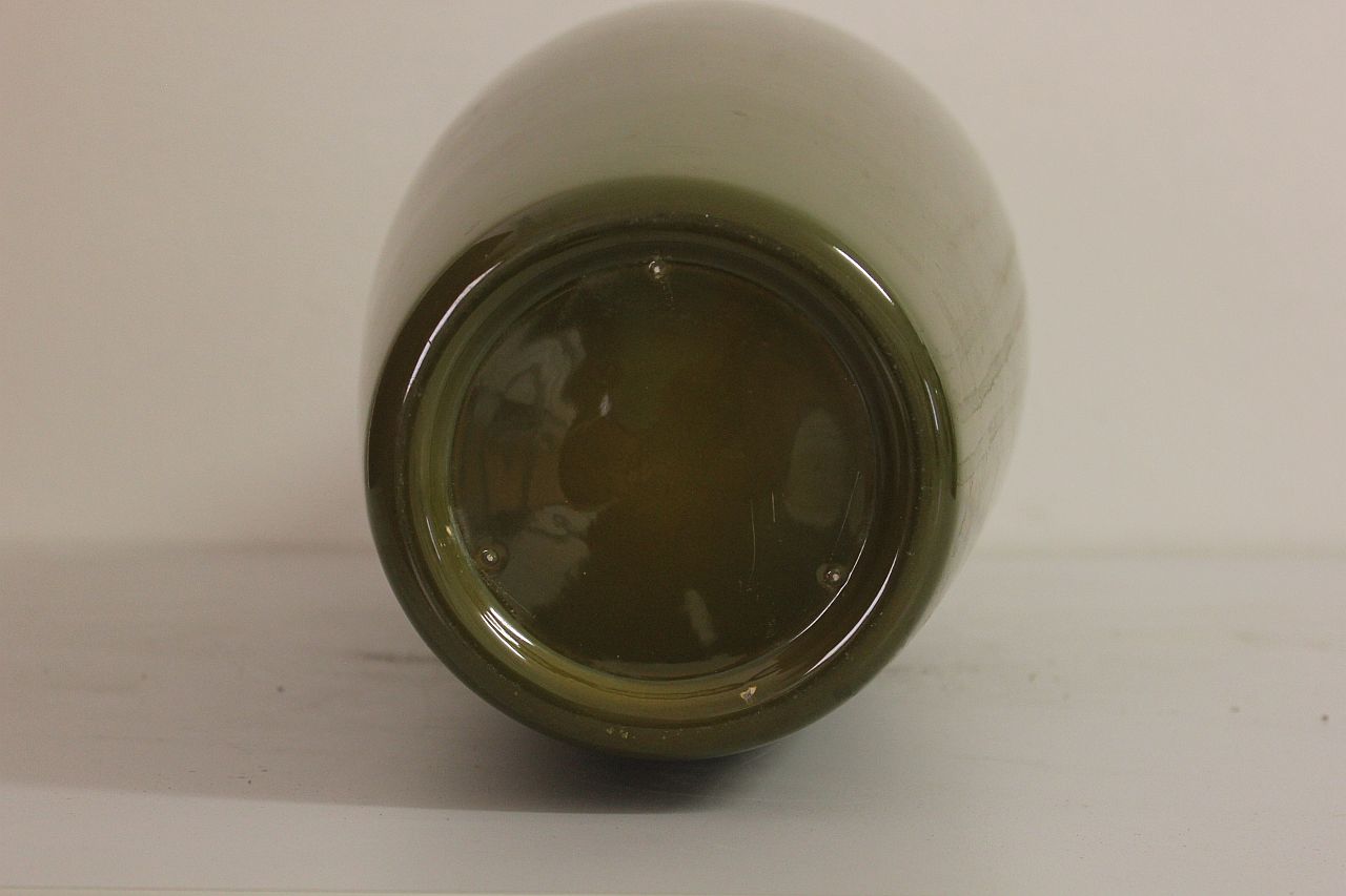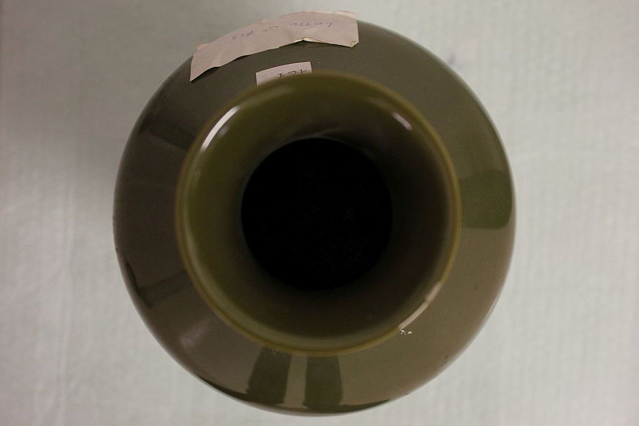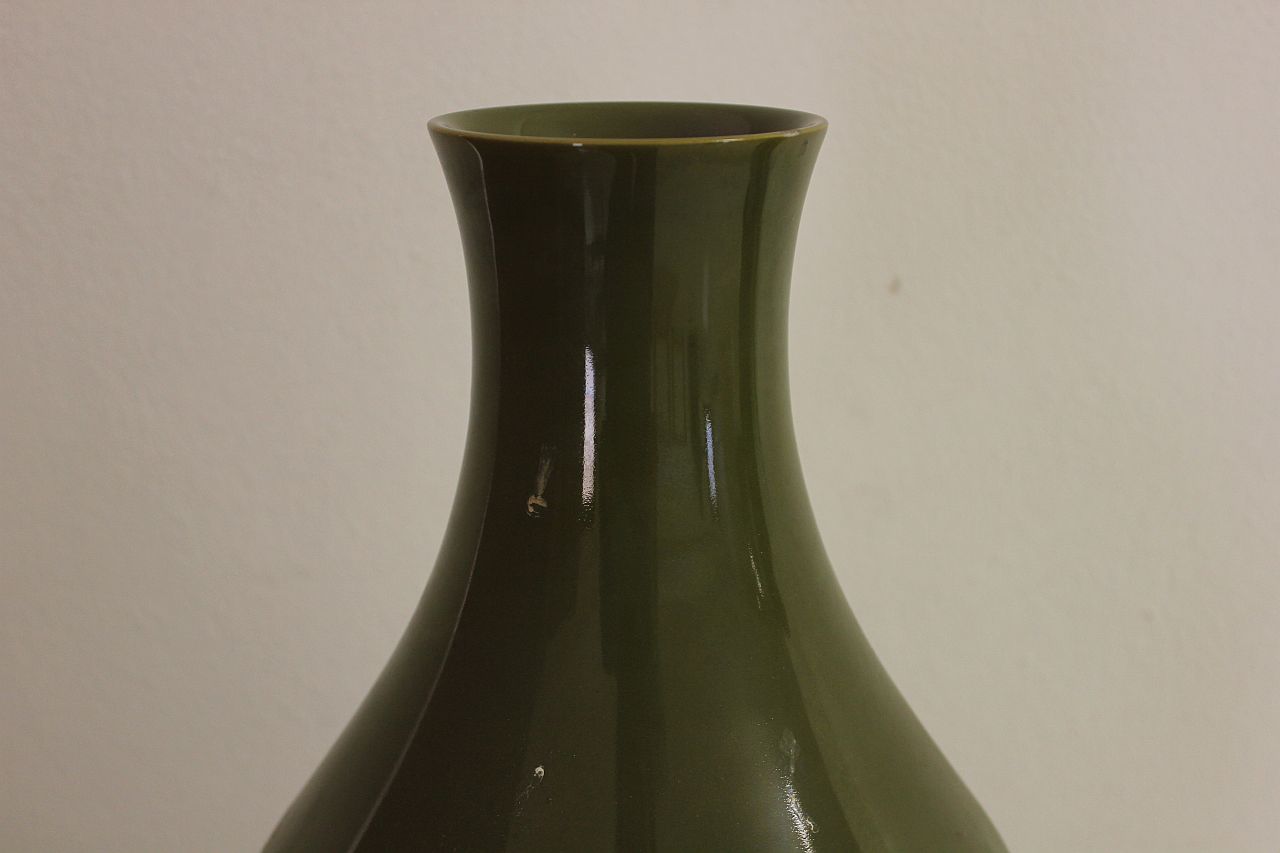 Vaso in ceramica con forma ovoidale, base e collo a raccordo netto sulla linea del profilo. Monocolore verde bruciato