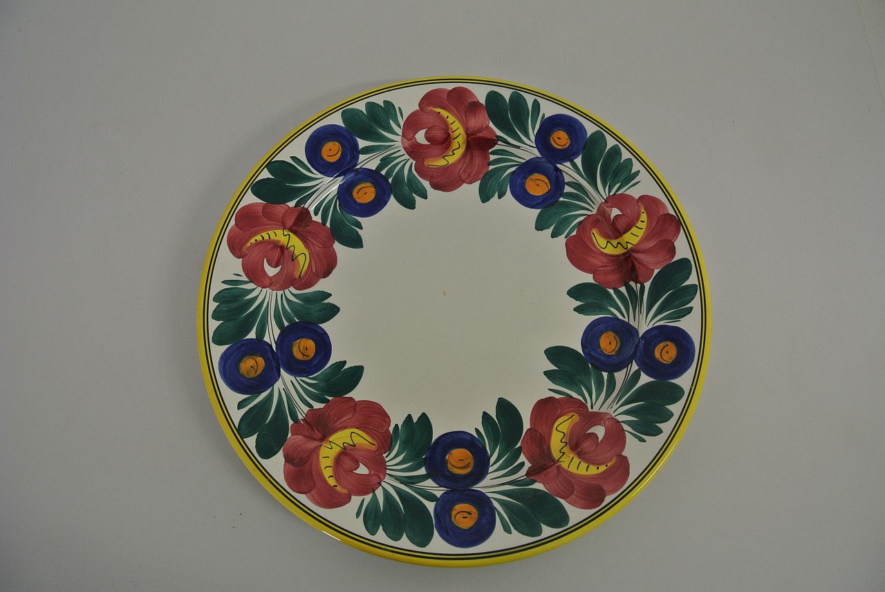 Due piatti in ceramica, fondo bianco, bordo giallo con filetti neri, sull'orlo e sul cavetto corona con begonie rosse e corolle blu con foglie verdi