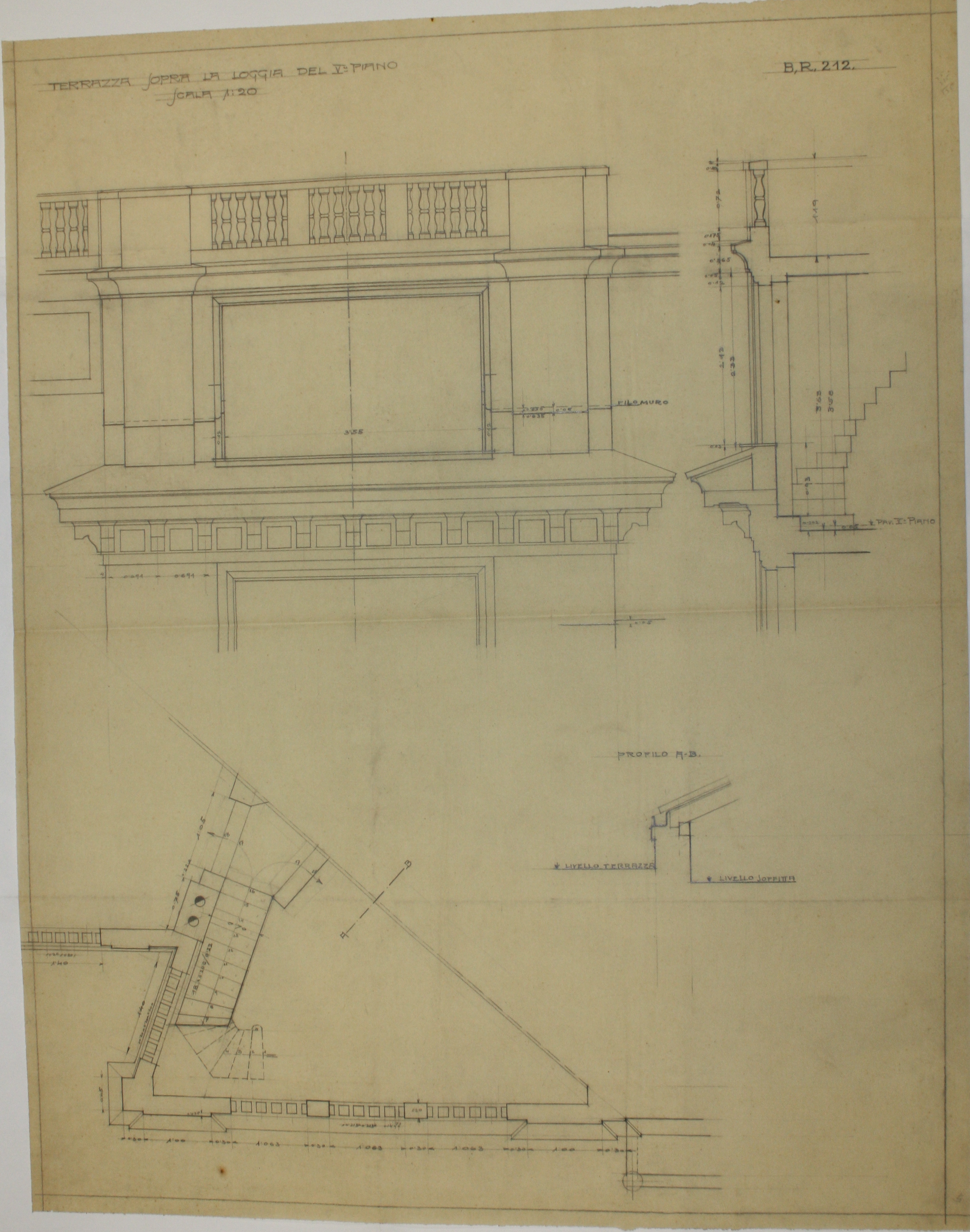 Pianta, prospetto e sezione sopra la loggia del V piano in scala 1:20