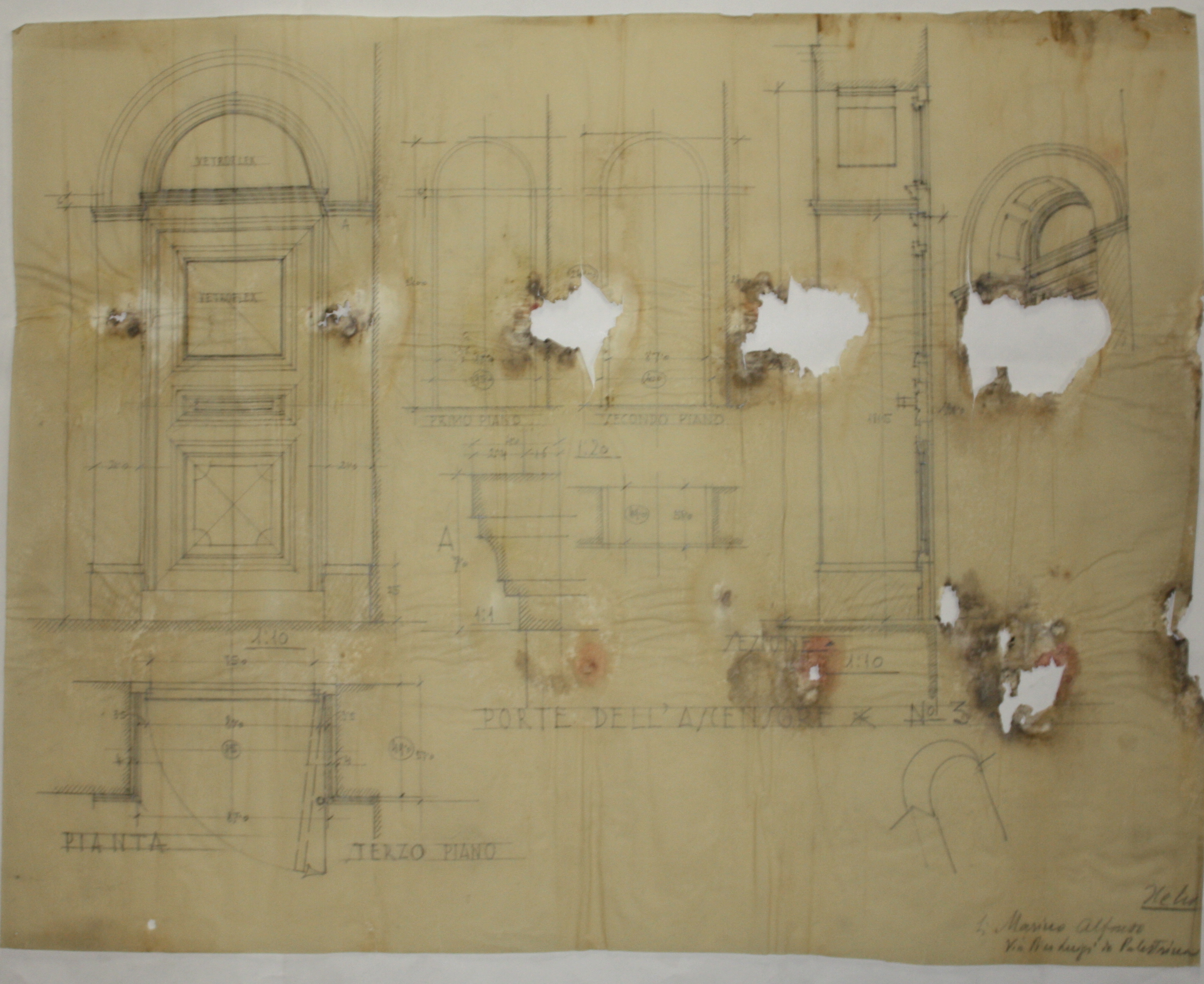Pianta, sezione e prospetto della porta dell’ascensore in scala 1:10. Sul lato destro schizzo assonometrico delle modanature che lo circondano