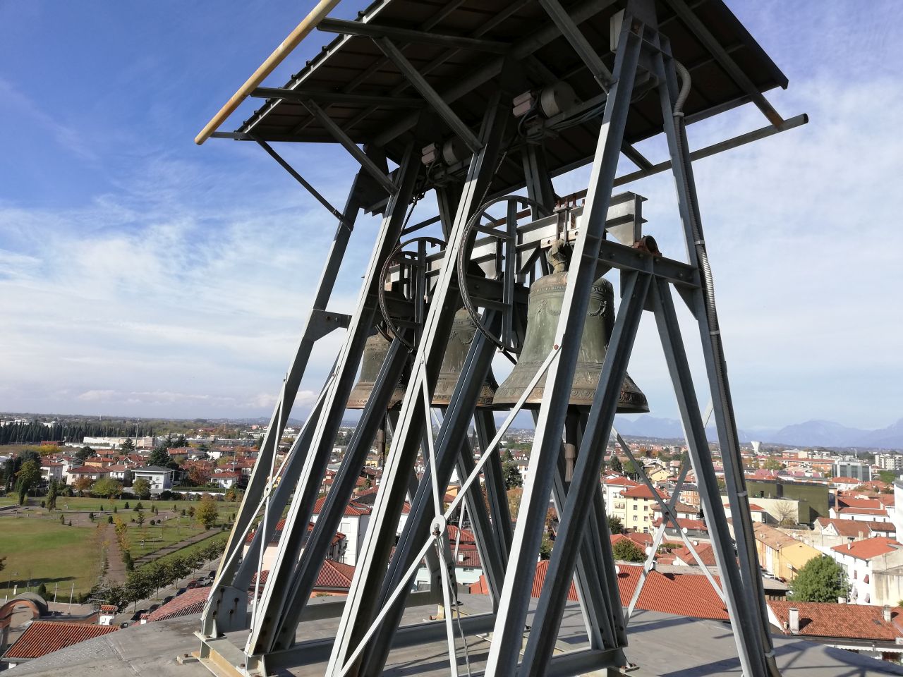 Le campane sono collocate sul ballatoio esterno del tamburo della cupola, in direzione ovest. Sono campane "a slancio" con movimento a ruota meccanica supportate da una robusta struttura a cavalletto in acciaio. I manufatti sono decorati a rilievo, le maniglie che collegano la campana al ceppo sono a ricciolo ricoperte da decorazioni a foglie d'acanto; al di sotto una doppia fascia di tre archi contiene l'iscrizione commemorativa, una teoria di putti svolazzanti sostiene una corona continua di festoni. Due campane presentano il corpo principale cadenzato e quadripartito da figure in rilievo che rappresentano: Cristo Crocifisso, Madonna con Gesù Bambino, San Michele Arcangelo e San Nicolò; la terza campana presenta lo stesso schema ma varia nelle rappresentazioni, che si identificano in: San Pietro, Gesù con la Croce, San Giuseppe e San Nicolò. Il bordo di battitura contiene, all'interno di una fascia, l'iscrizione con l'anno di costruzione e la fonderia, mentre i bordi sottostanti sono decorati rispettivamente con foglie d'acanto e girali