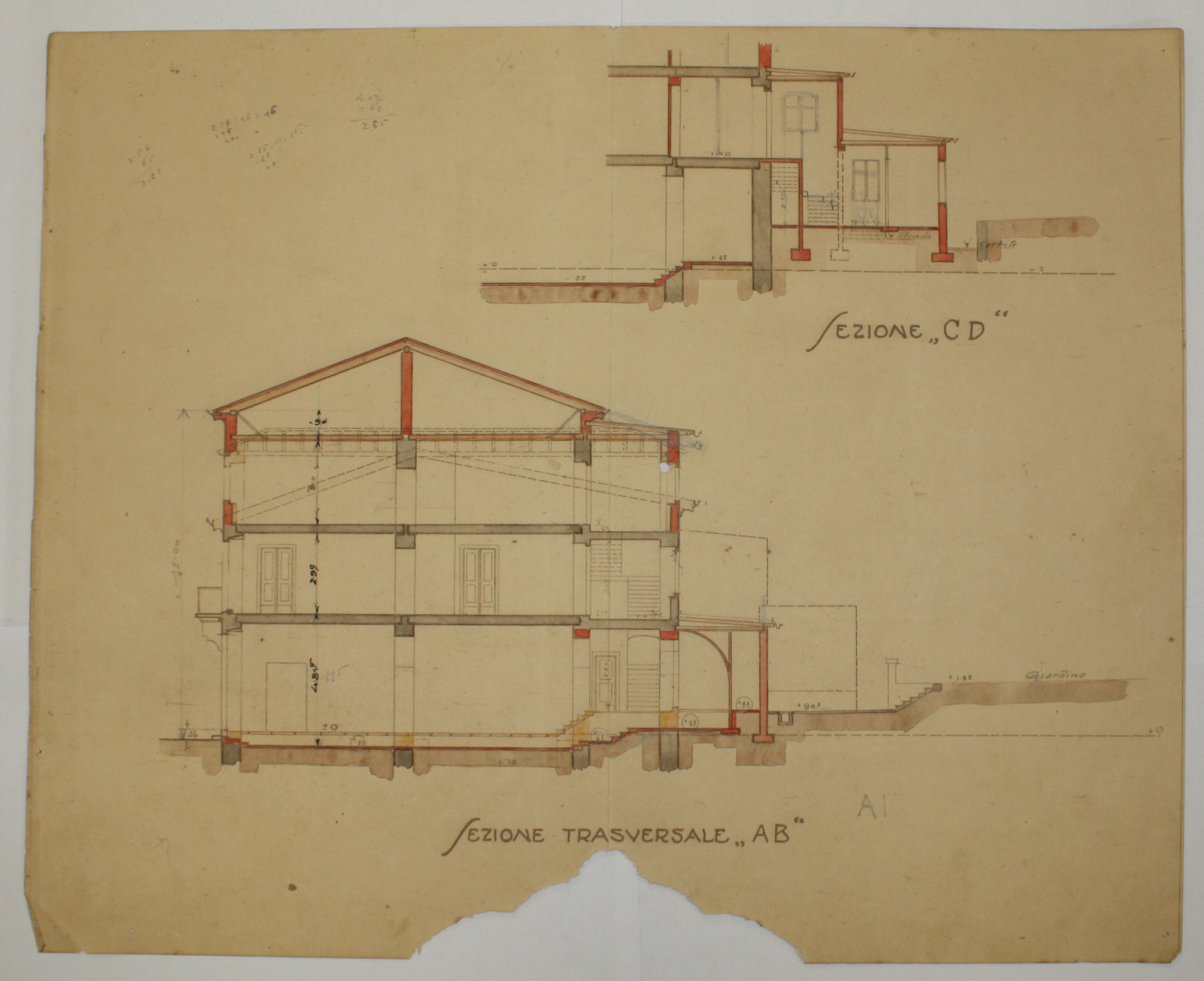 Sezioni trasversali in scala 1:100. In colore rosso e giallo sono indicate le parti oggetto della ristrutturazione