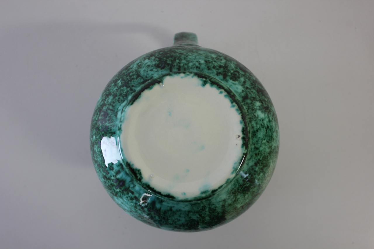 Boccale in ceramica con orlo espanso ed ampio becco, ansato. Fondo bianco con decoro marmorizzato nei toni del verde ramina, dipinto a spruzzo