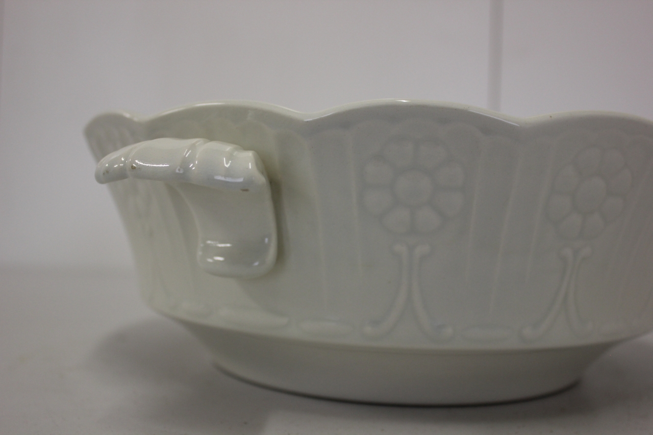 Zuppiera in ceramica smaltata. Parte superiore del corpo a tronco di piramide poligonale, parte inferiore tronco conica concava; manici a voluta vegetale, applicati. Coperchio a incasso conico, liscio; terminale a corolla tronco conico incavato, disposto al centro di un piccolo rosone a spicchi. Fondo avorio decorato sulle facce da corolle in rilievo e rocailles accostate in senso verticale