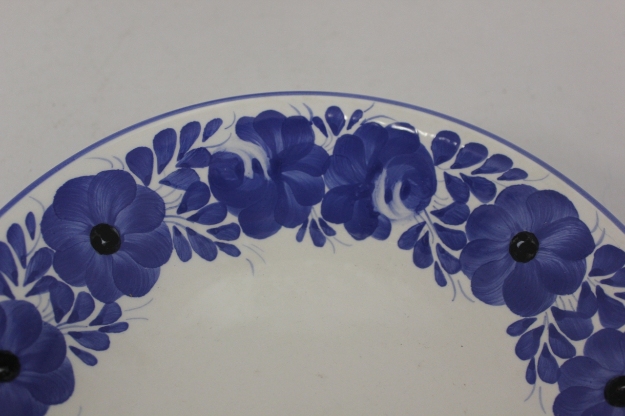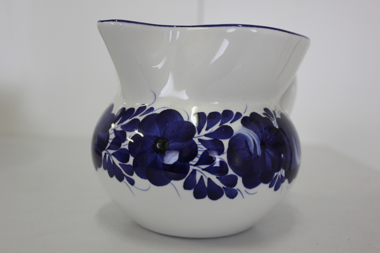 Servizio "Merano" da cinque pezzi in ceramica dipinta formato da insalatiera, boccale, due piatti piani ed una scodella. Per tutti fondo bianco con decoro a coroncina di fiori e foglie blu, filetti blu
