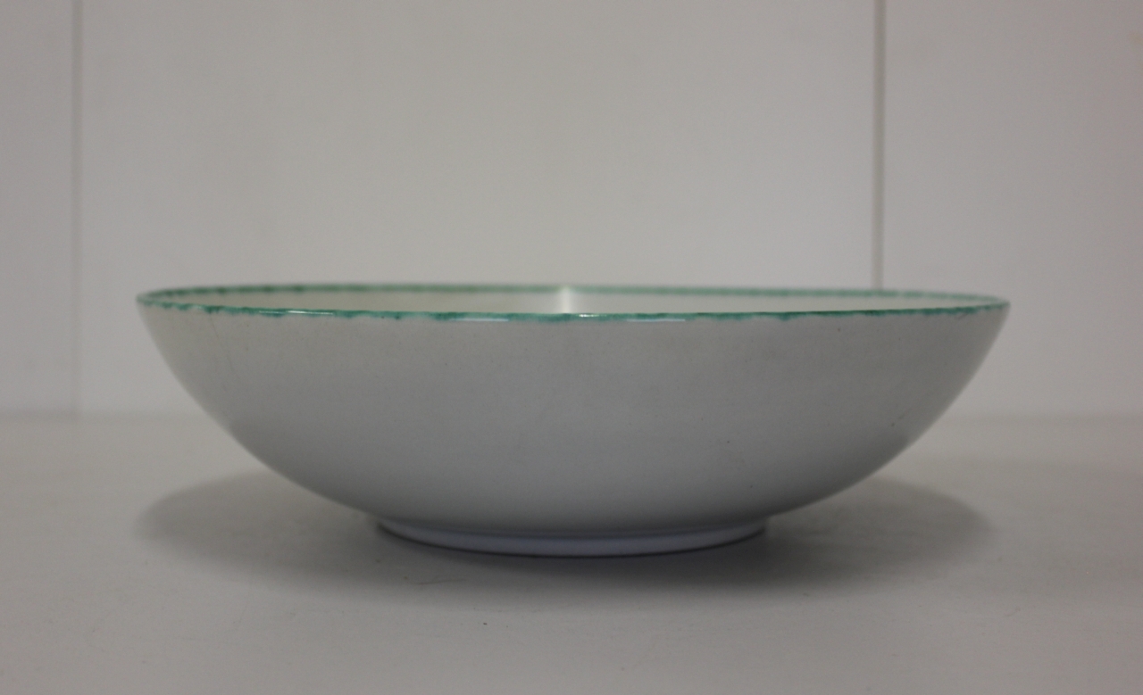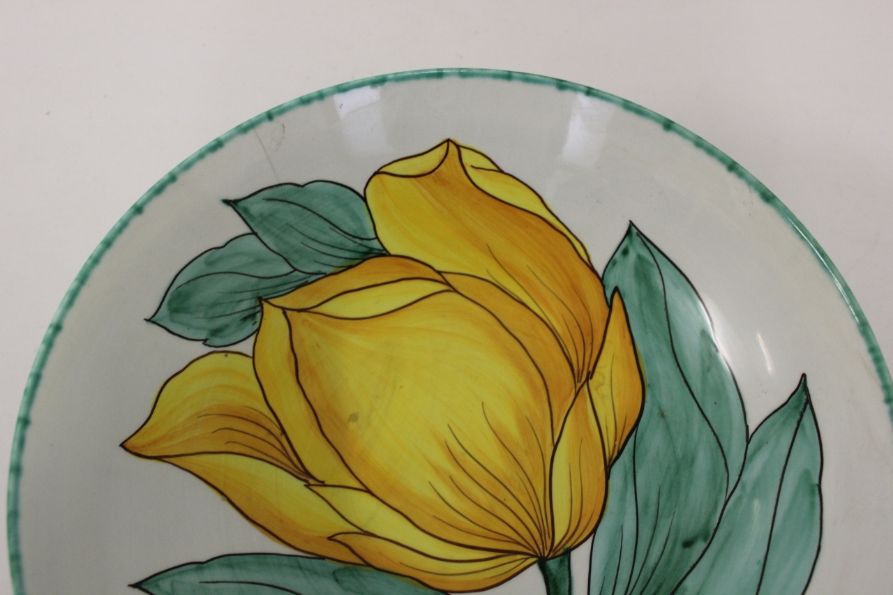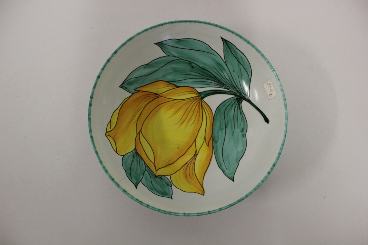 Insalatiera in ceramica dipinta, corpo a calotta bassa, piede piccolo semicilindrico. Fondo bianco, cavetto decorato a mano con grande fiore giallo tra foglie verdi, filettato in nero. Filetto verde ramina sul bordo