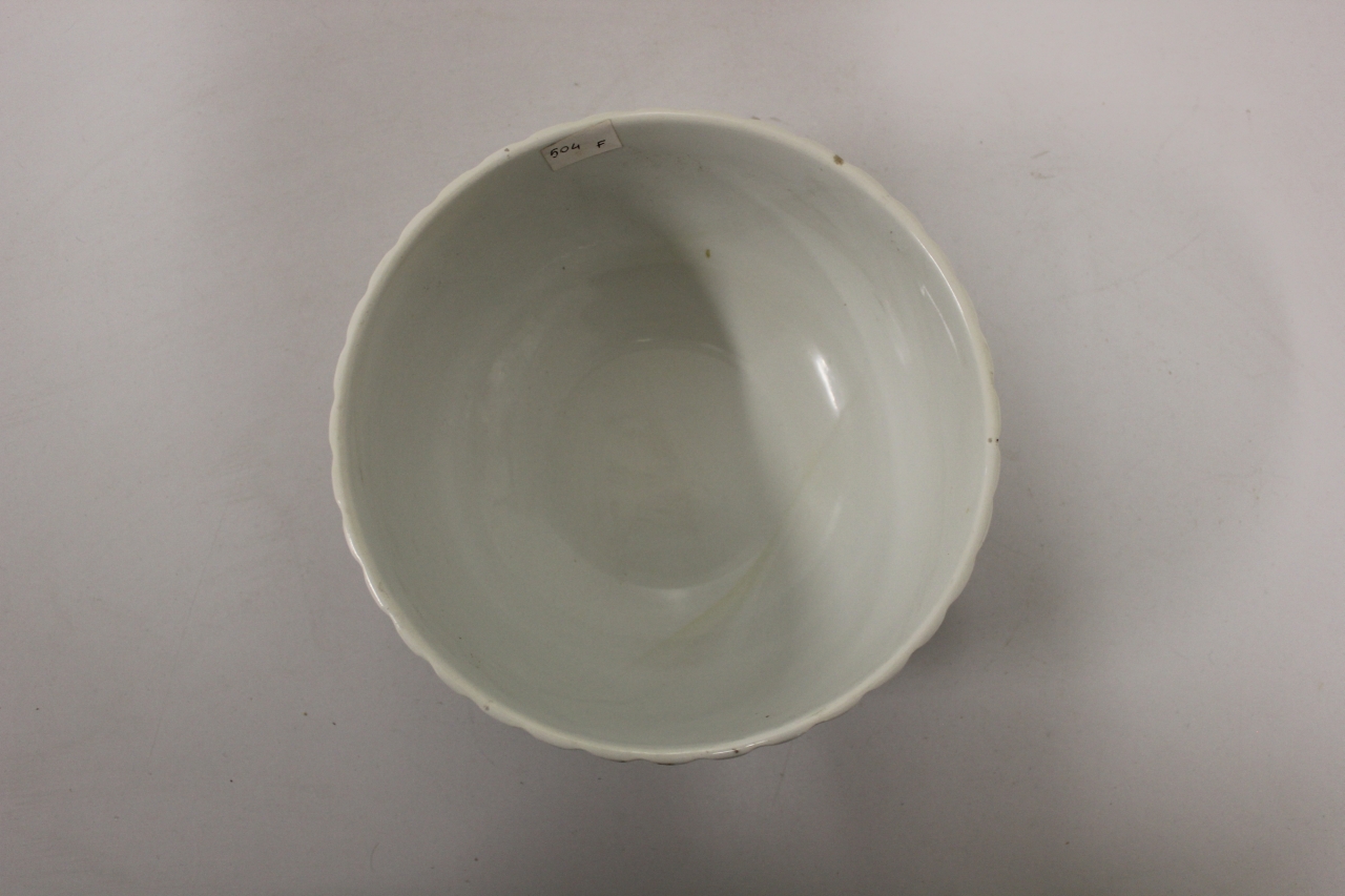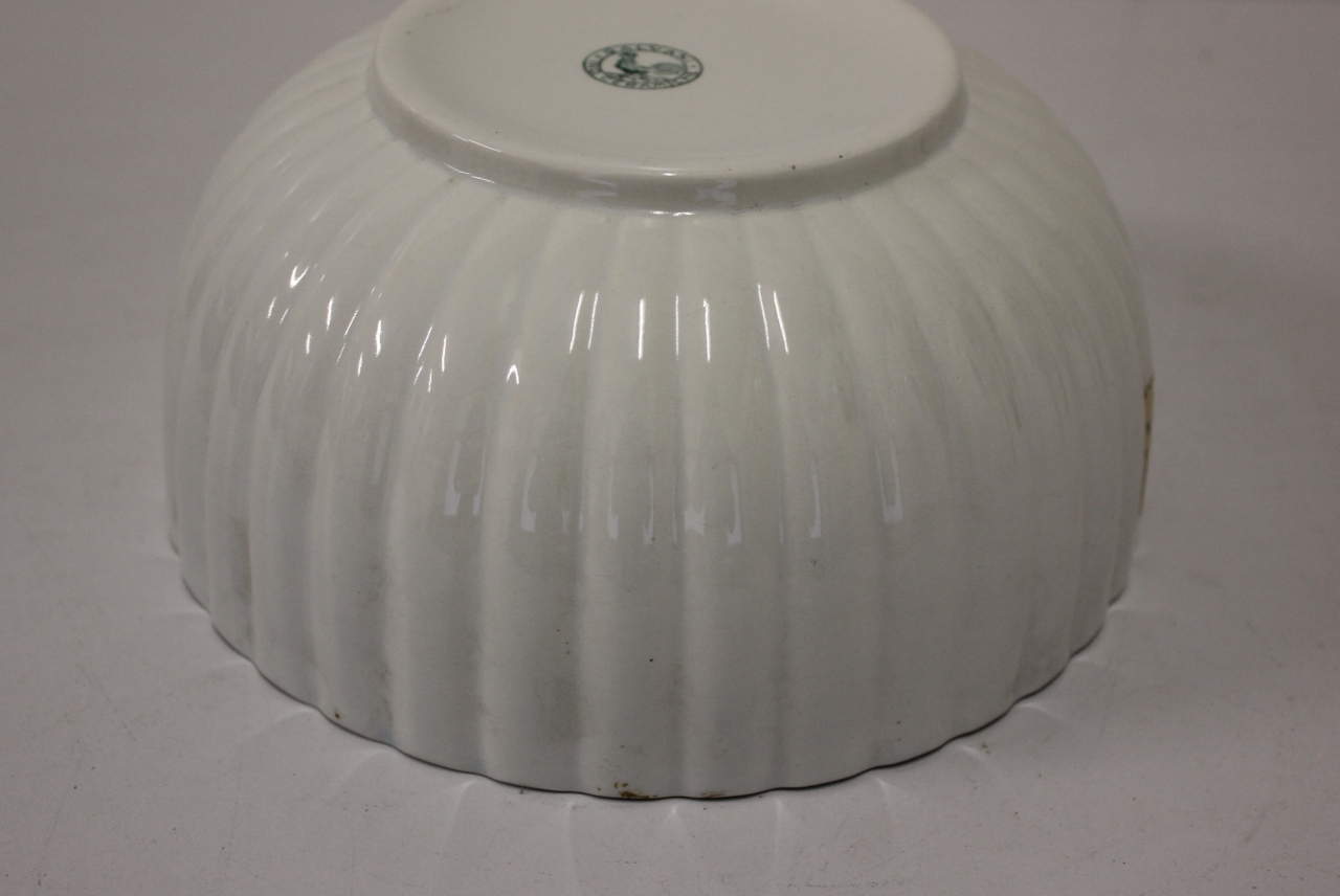 Insalatiera in ceramica, corpo semisferico molto alto, piede tronco conico. Interno liscio, esterno modellato con costolature a spicchi