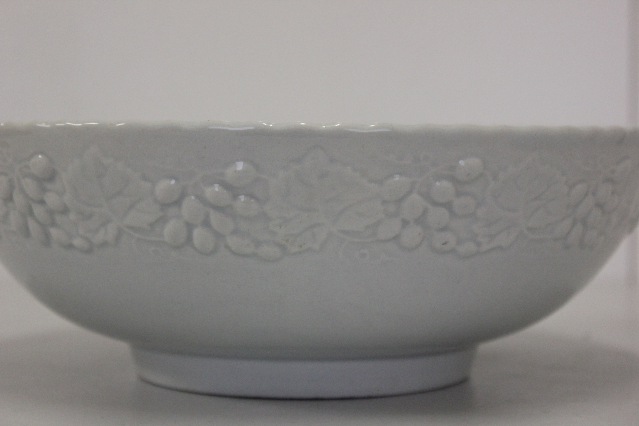 Insalatiera in ceramica dal corpo a calotta, piede semicilindrico molto alto. Interno liscio, esterno modellato con fascia decorativa in rilievo con uva e foglie