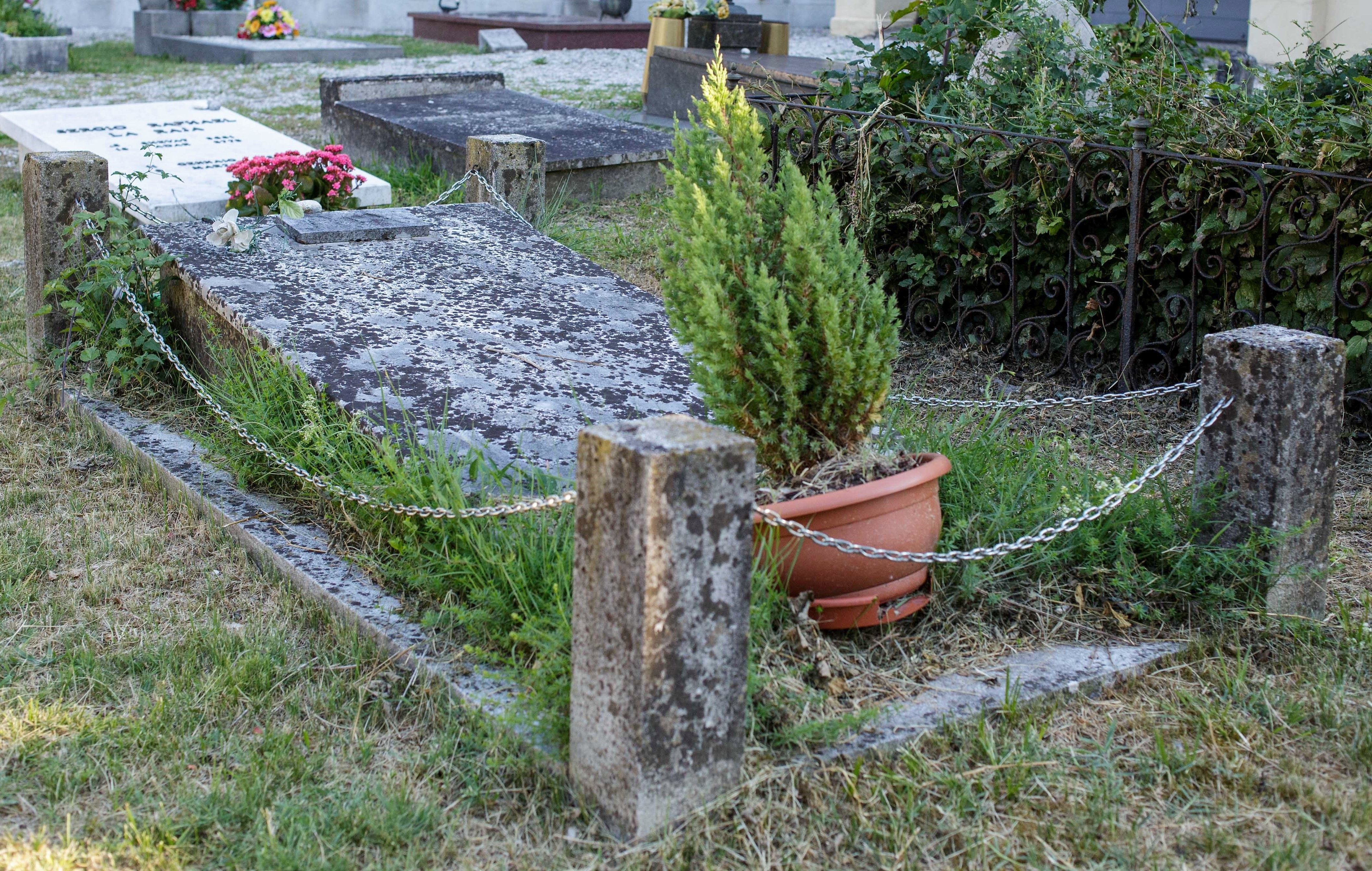 Lastra di marmo rettangolare con epitaffio inciso posta orizzontalmente. Un rettangolo in marmo è sovrapposto nella parte superiore. L’area è delimitata da quattro cippi parallelepipedi uniti da una catena
