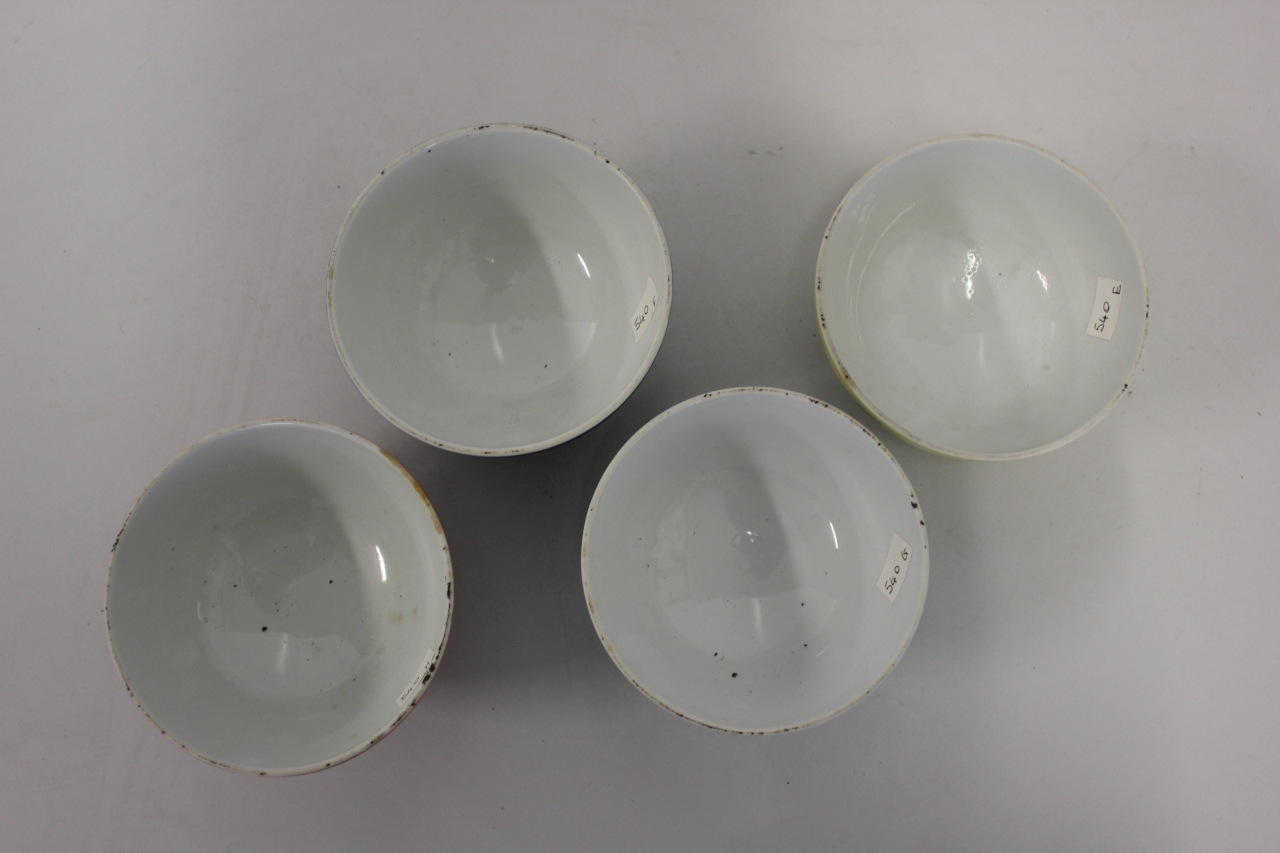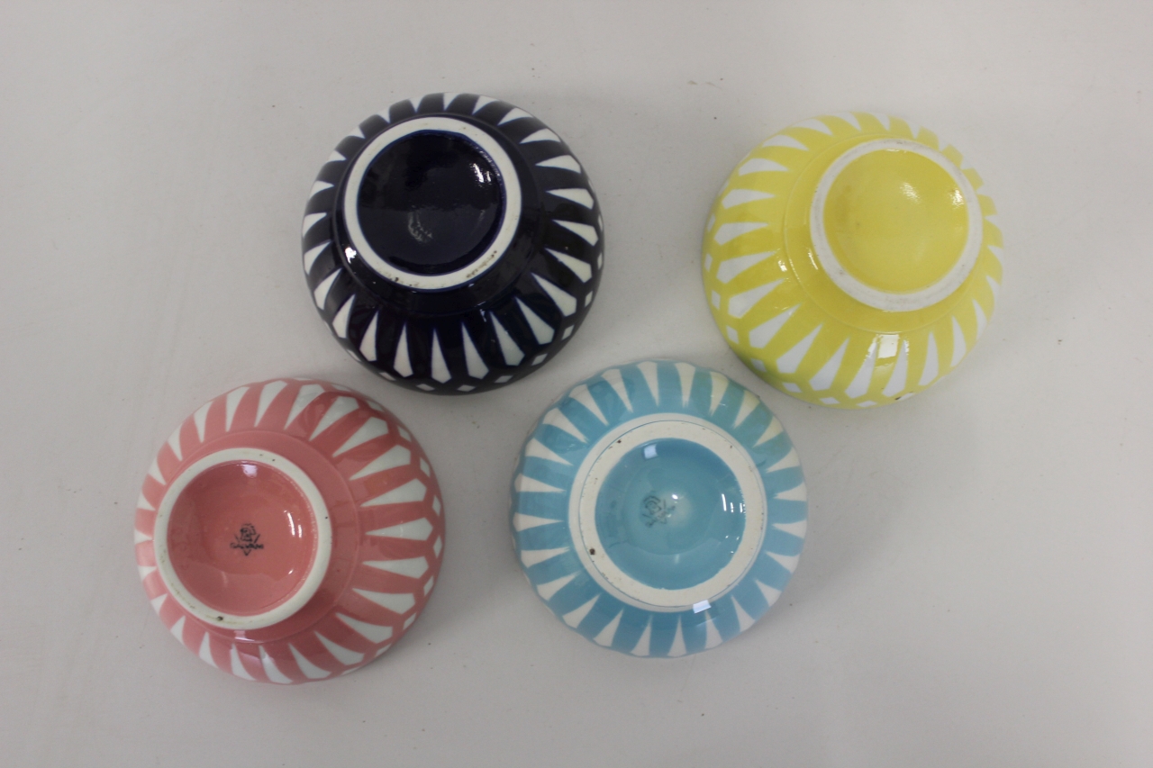 Serie di quattro scodelle in ceramica dipinta, corpo ovale, piede espanso. Decoro con motivi geometrici a losanghe verticali in negativo di colore bianco con fondi rispettivamente di colore giallo, blu, azzurro e rosa