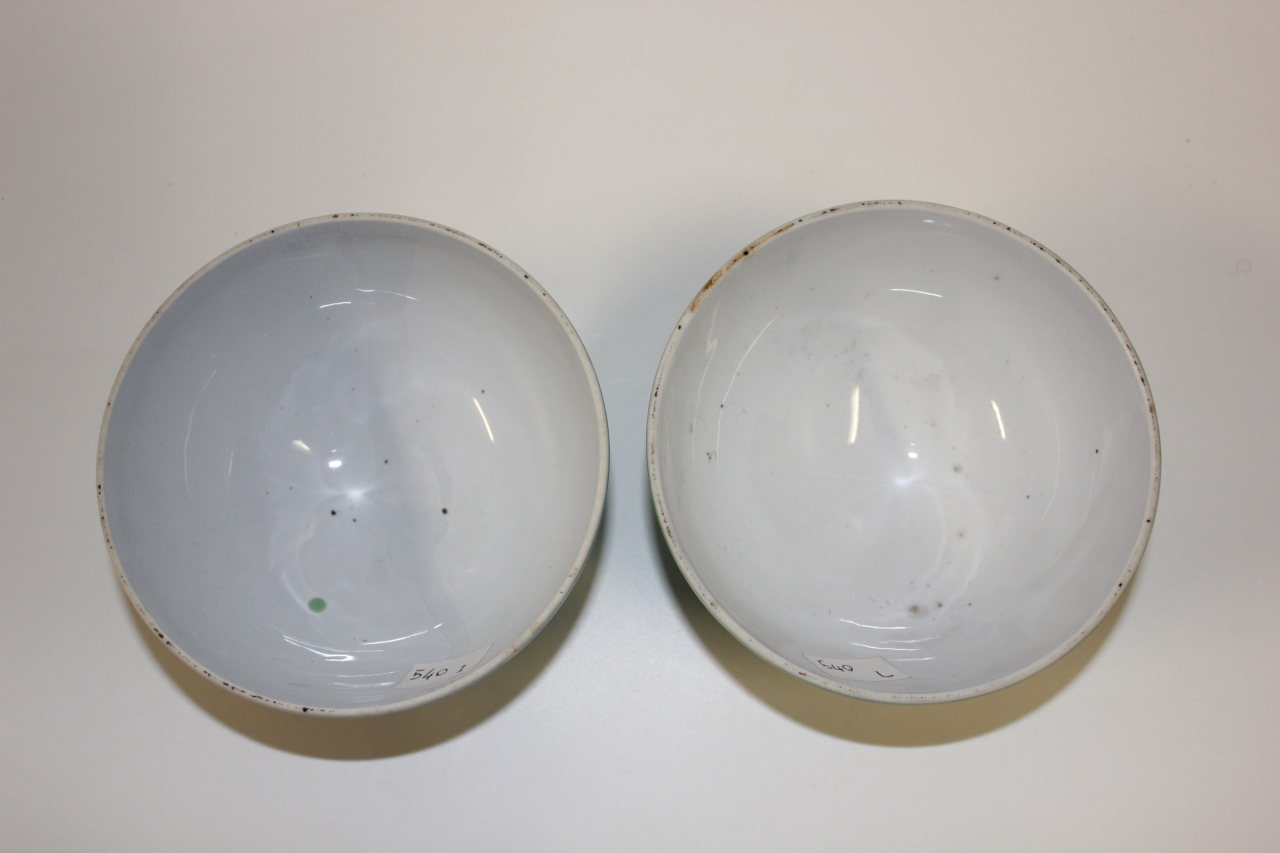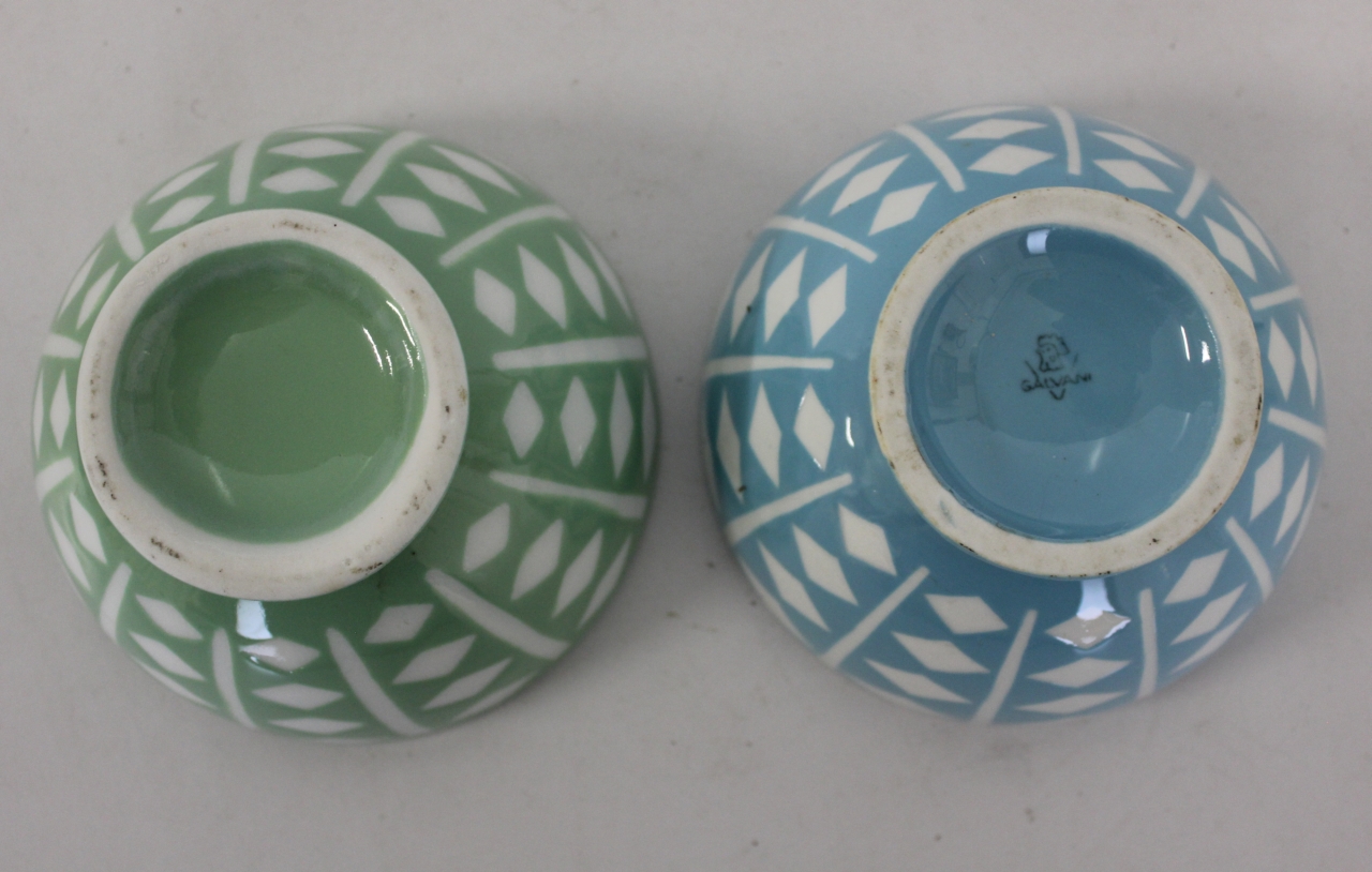 Coppia di scodelle in ceramica dipinta, corpo ovale e piede espanso. Decoro con motivi geometrici a losanghe orizzontali intervallate da linee rette in negativo di colore bianco con fondi rispettivamente di colore verde e azzurro