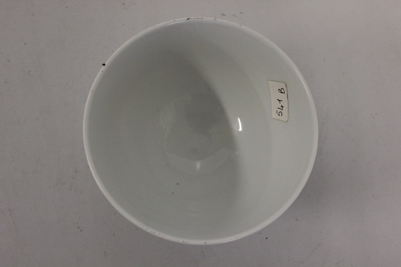 Scodella in ceramica modellata e dipinta, corpo ovale, piede cilindrico. Fondo bianco, decoro personalizzato entro coroncina ovale, timbrato in colore blu