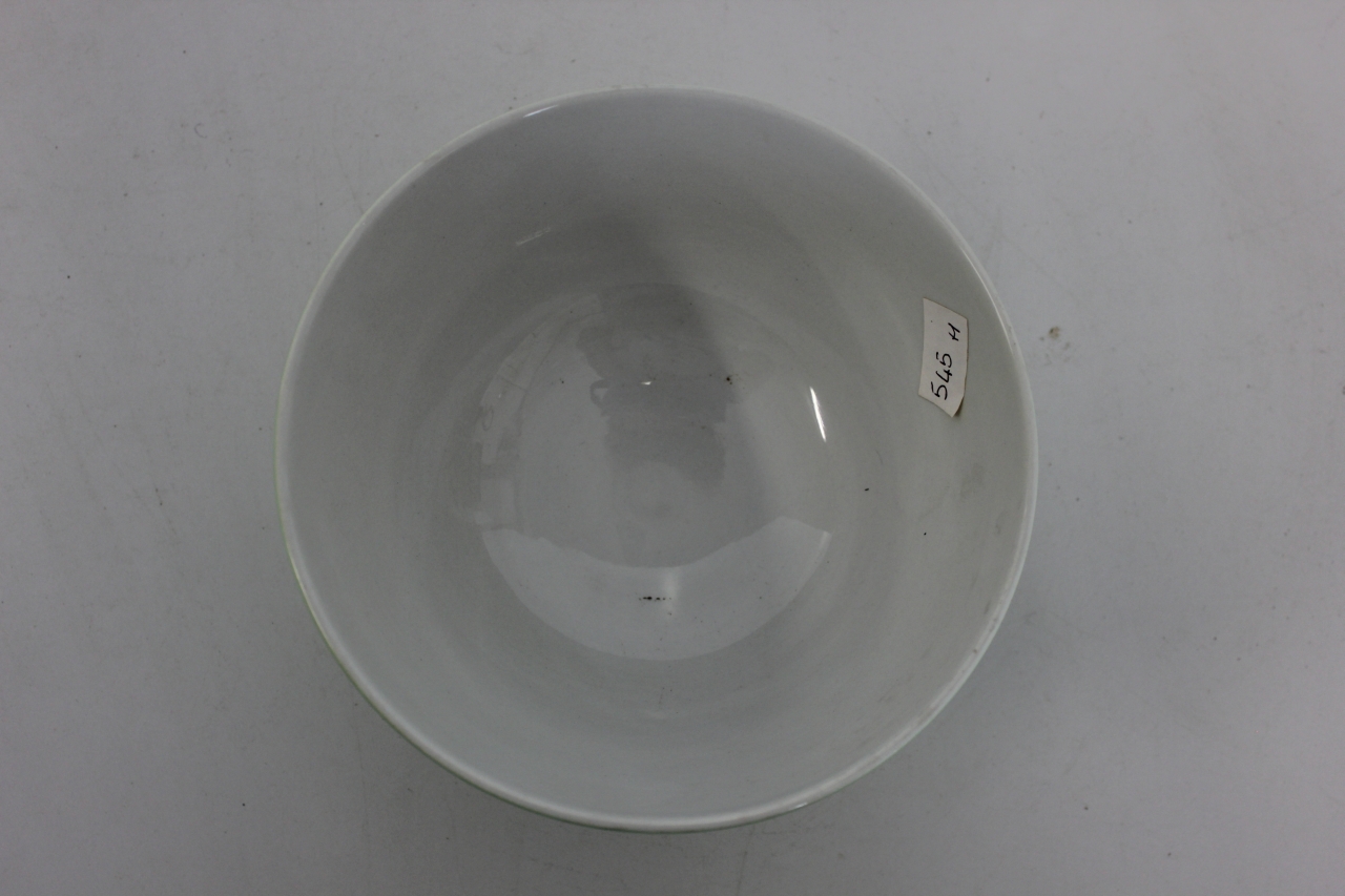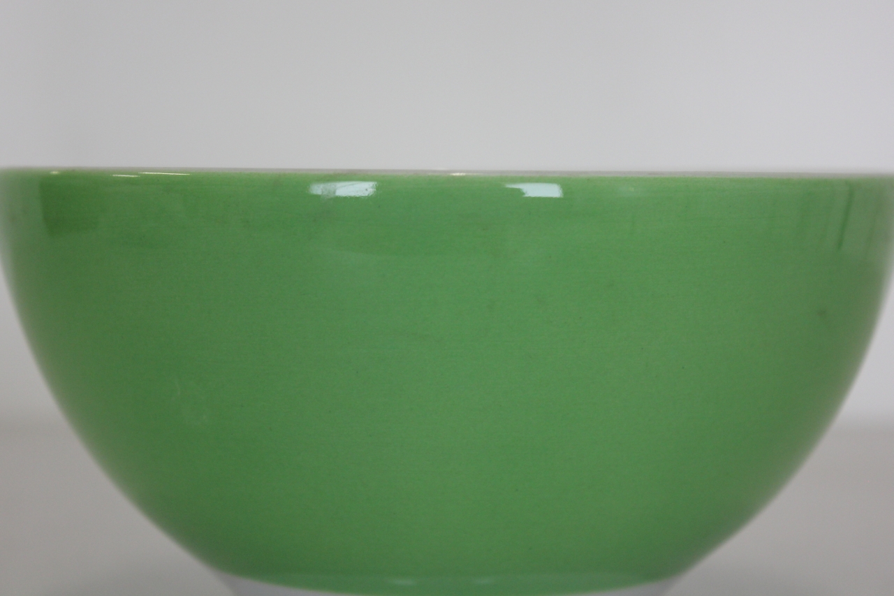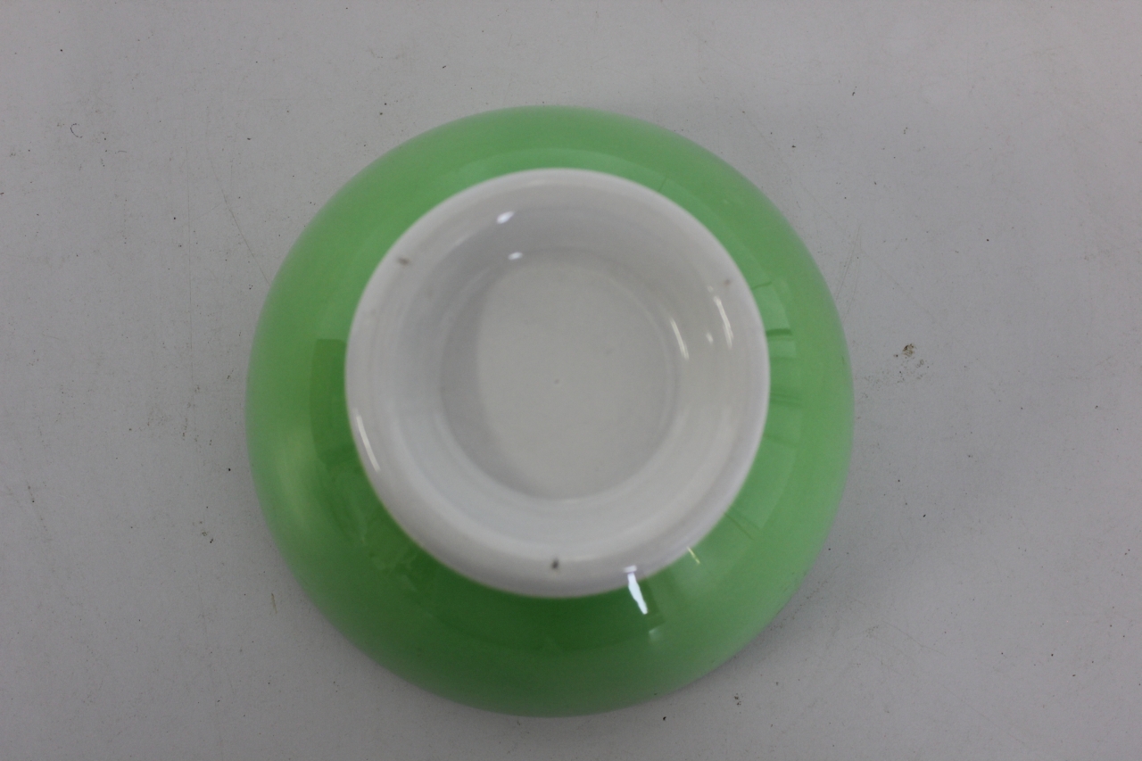 Scodella in ceramica modellata e dipinta, corpo ovale e piede espanso. Fondo bianco con corpo dipinto esternamente con fascia monocromatica in colore verde