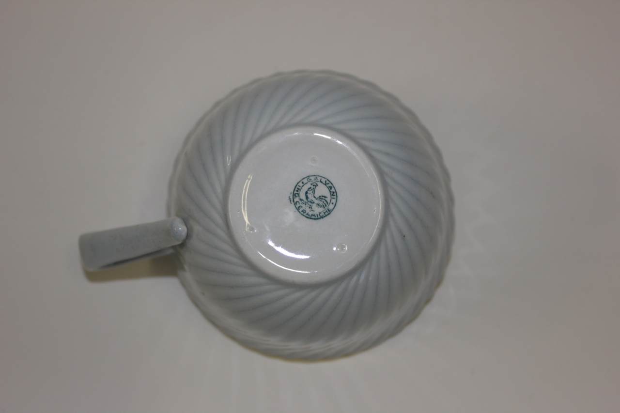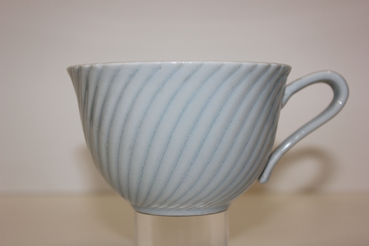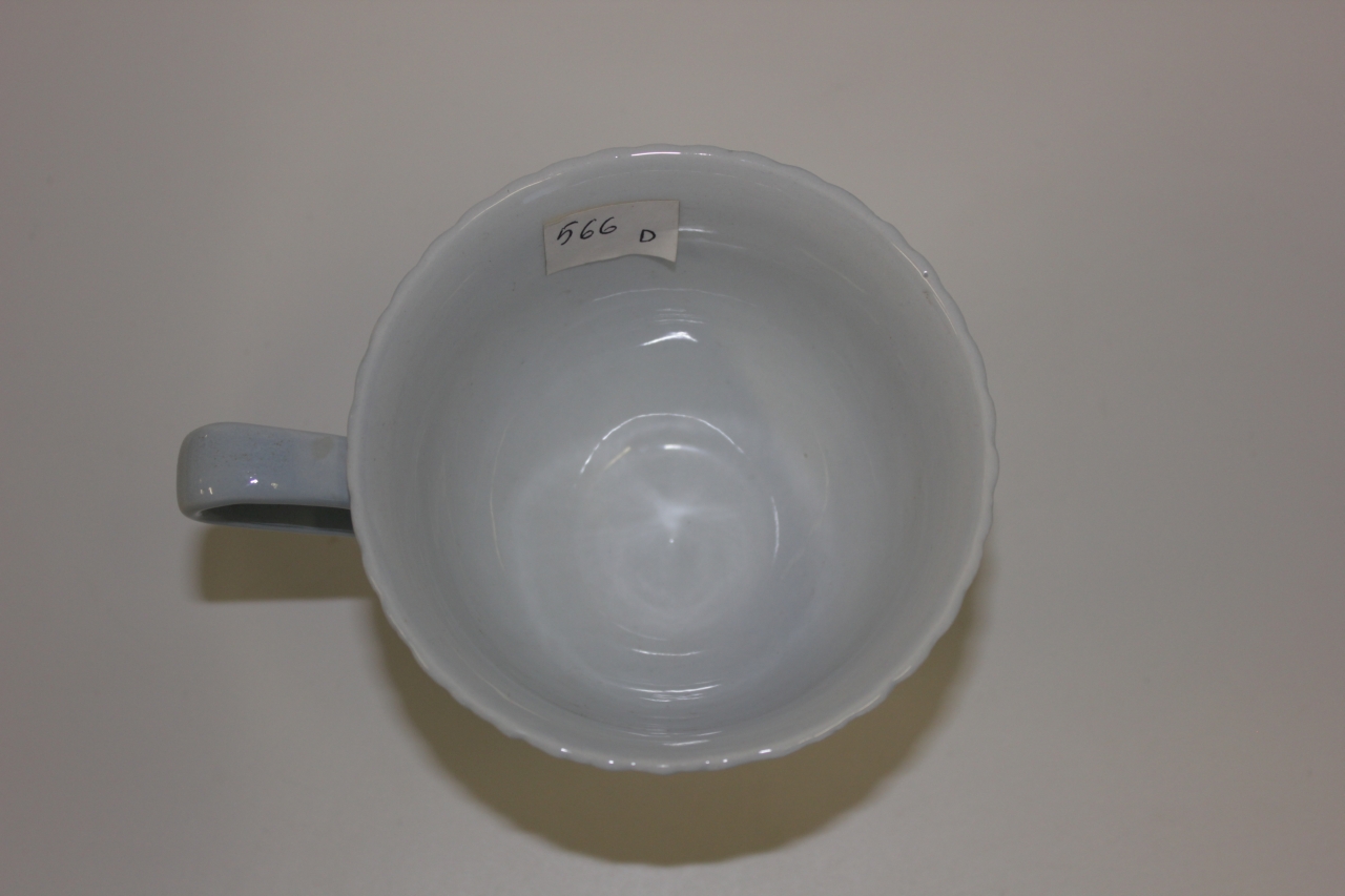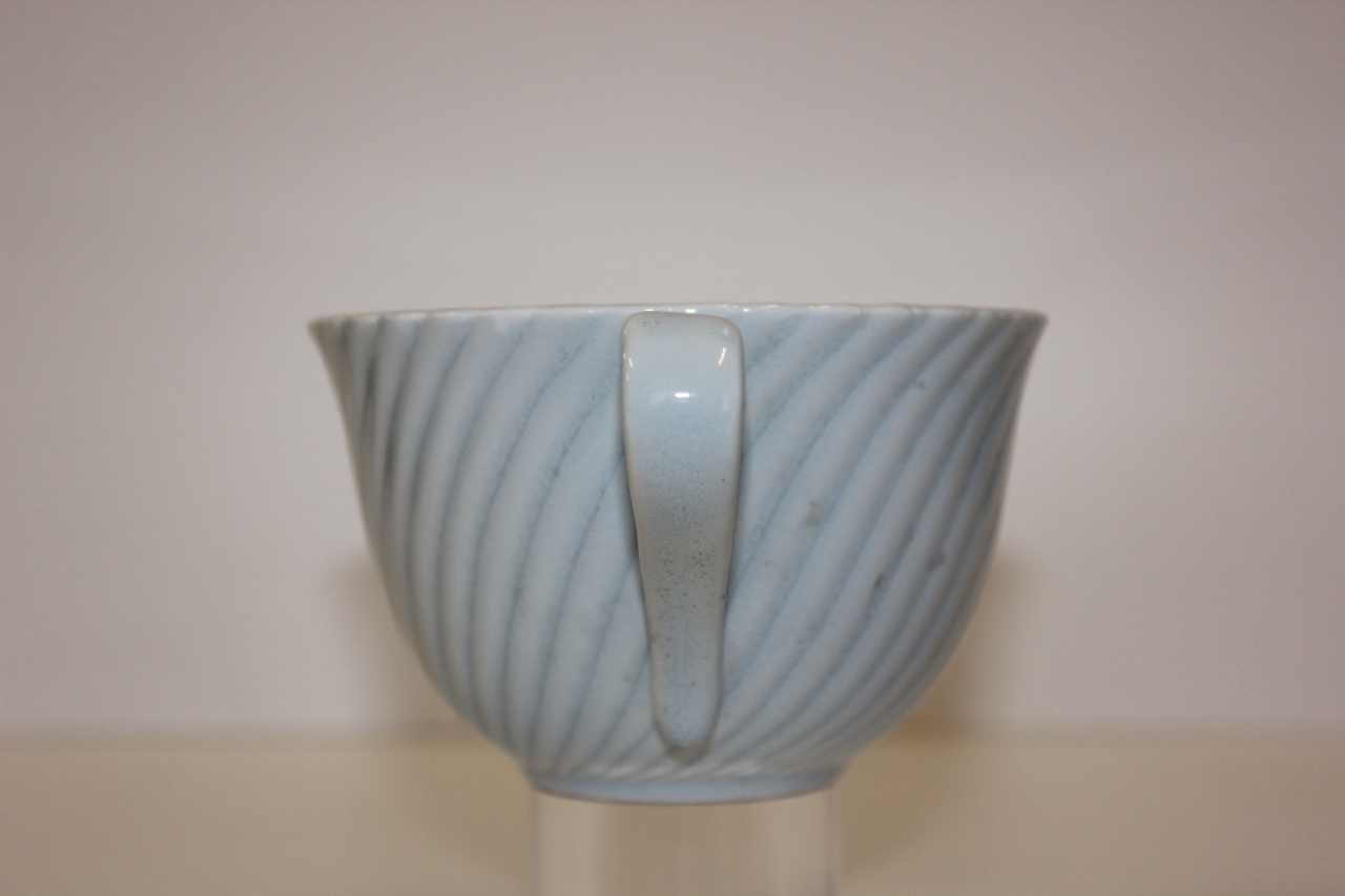 Tazza in ceramica modellata e dipinta, corpo ovale con bordo espanso e lobato, piede cilindrico, manico ad archetto. Esterno modellato con righe ampie a torciglione in rilievo. Fondo bianco, esterno dipinto con colore monocromo azzurro