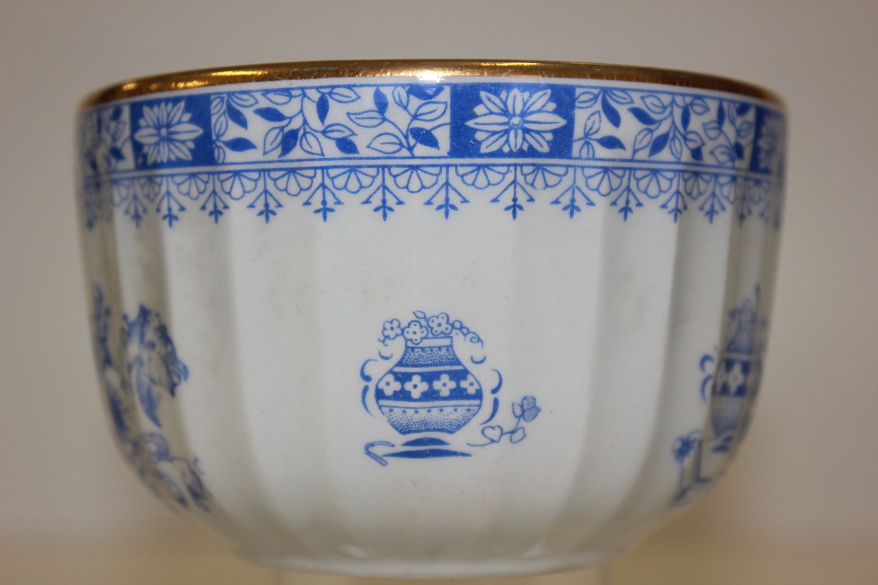 Tazza in ceramica modellata e dipinta, corpo cilindrico a rientrare, piede cilindrico, manico ad arco. Esterno modellato a scanalature. Fondo bianco, decoro a fascia interna ed esterna in colore blu con elementi decorativi floreali, al di sotto decoro in stile orientale. Filetti oro su bordo e manico