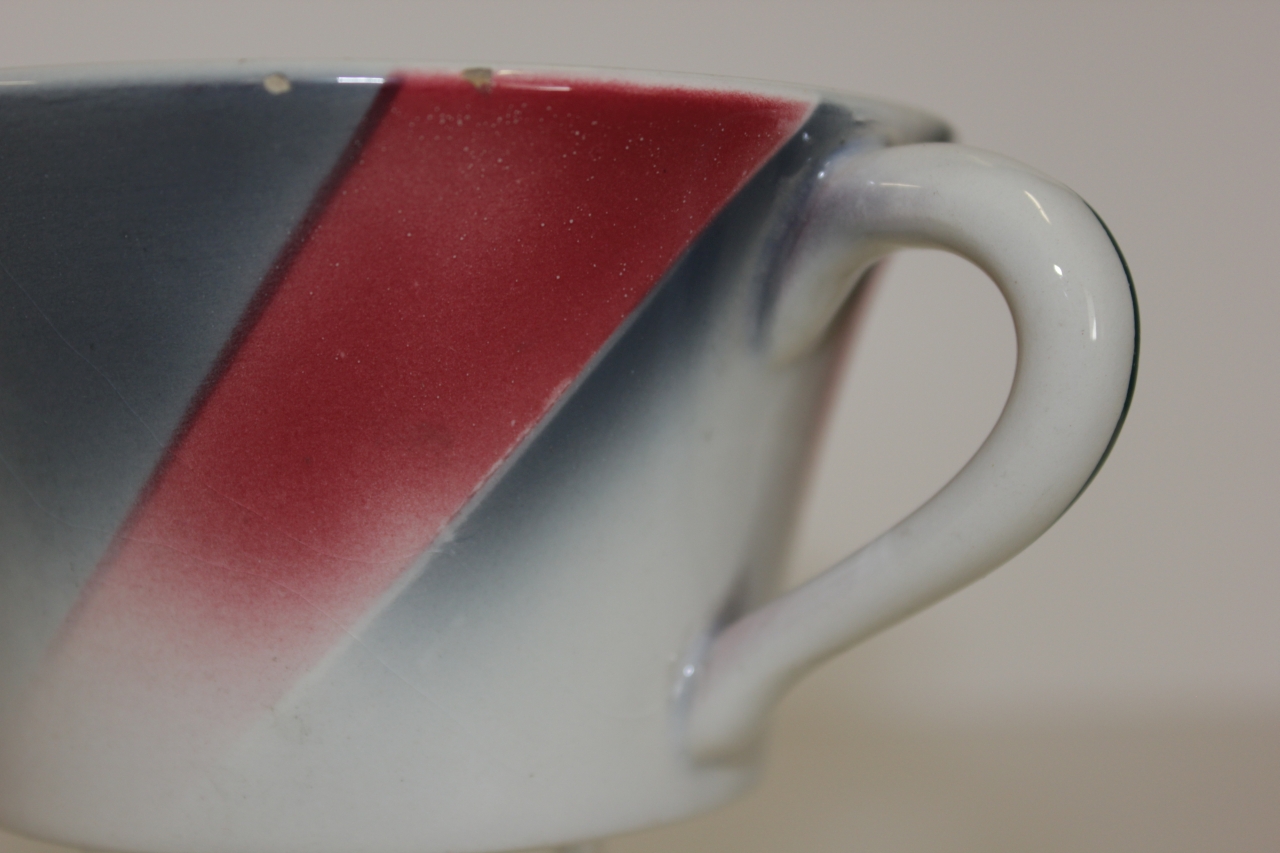 Serie di cinque tazze in ceramica modellata e dipinta, corpo a forma cilindrica con espansione progressiva dalla base. Manico ansato tondo. Fondo bianco, filetto verde ramina sul manico, decoro ad aerografo di bordo interno, sfumato in colore grigio ed arancione (tazza F), e corpo esterno, con strisce diagonali alternate, con sfumatura decrescente verso la base, nei colori grigio/arancione (tazza B), rosso/arancione (tazze C-F), grigio/rosso (tazza D) e grigio/verde (tazza E)