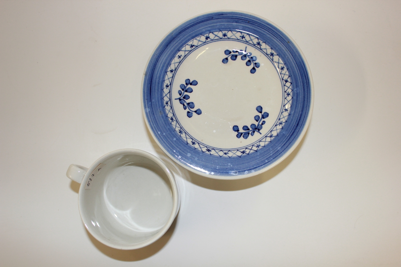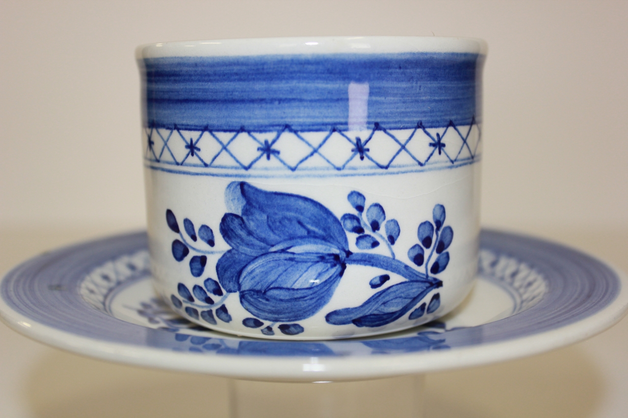 Tazzina da caffè con piattino in ceramica modellata e dipinta. Tazzina di forma cilindrica a rientrare, manico ad arco leggermente squadrato. Fondo bianco, fascia superiore con decori geometrici e floreali dipinti in colore blu cobalto, al centro peonia e tralci sparsi. Stesso decoro per il piattino