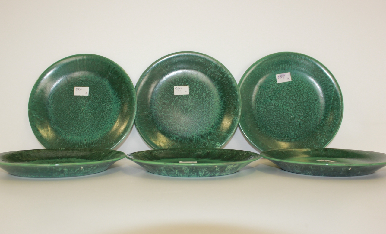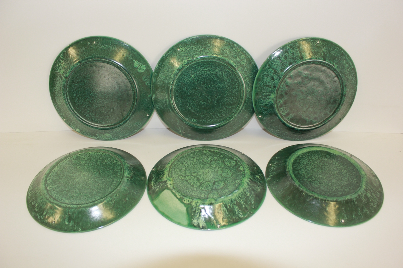 Serie di sei piattini in ceramica modellata e dipinta, forma tronco conica leggermente slabbrata. Decoro marmorizzato con sfumature e colature smaltate in colore verde