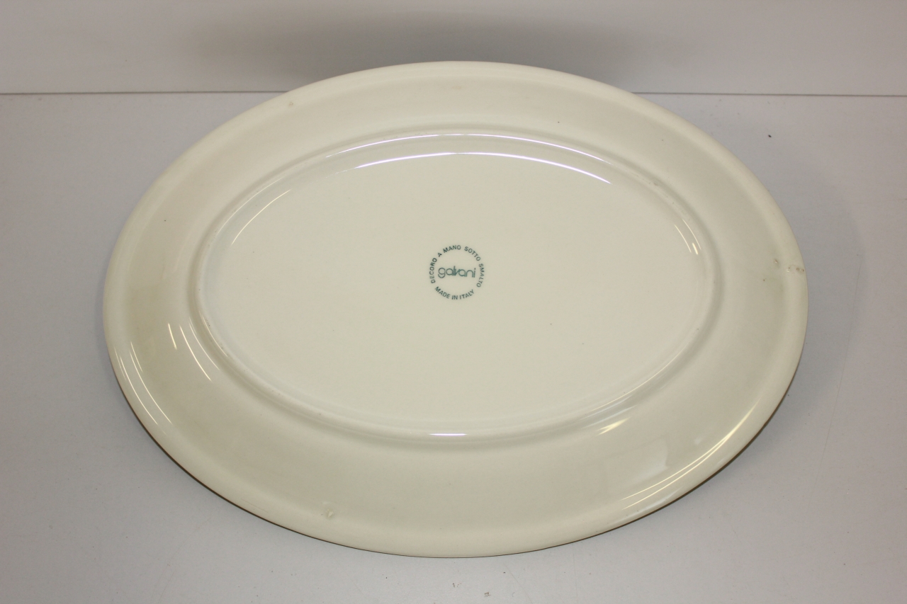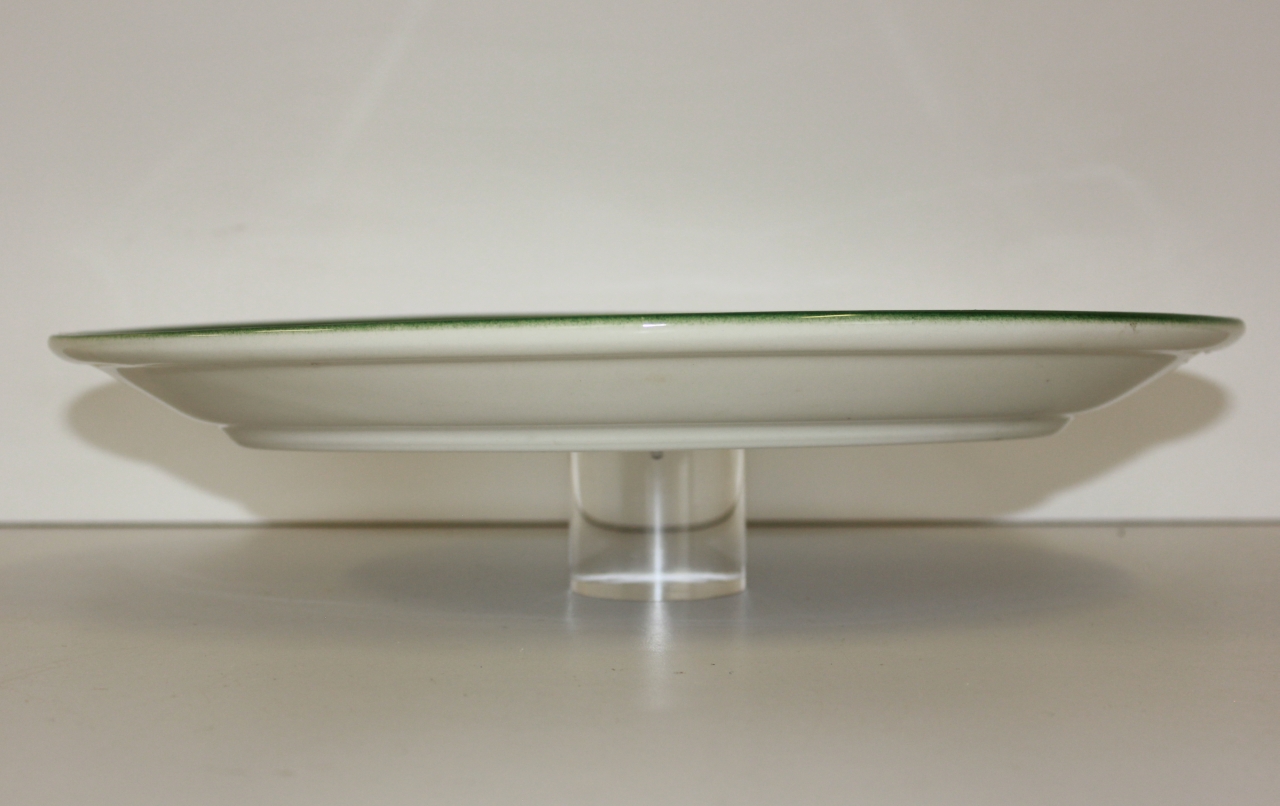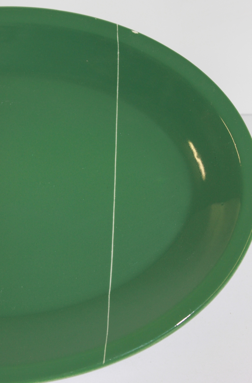 Piatto da portata in ceramica modellata e dipinta. Forma ovale, ala a doppia inclinazione. Fondo bianco, monocolore verde scuro, graffito verticale a destra, il tutto eseguito a mano e successivamente smaltato