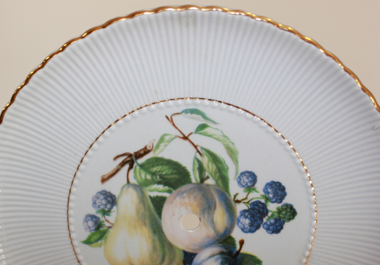 Coppia di piatti piani con foro al centro (piatti da alzata) in ceramica modellata e decorata, modello "Millerighe". Orlo ondulato, ala modellata a costine delimitata verso il cavetto da coroncina di perline. Fondo bianco, filetto oro sul bordo (secondo filetto dorato a margine del cavetto per il piatto A), al centro decalcomania con composizione di frutta