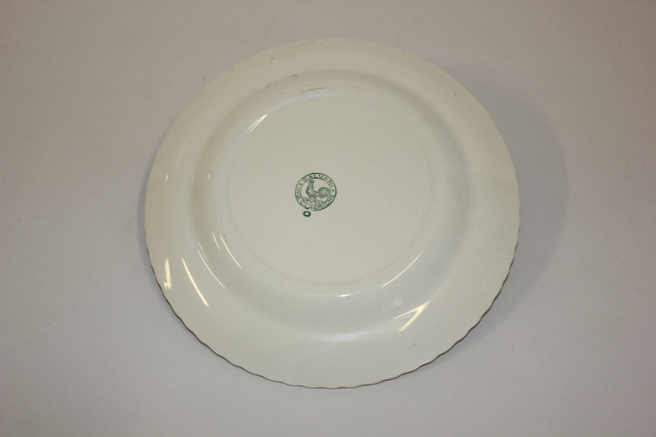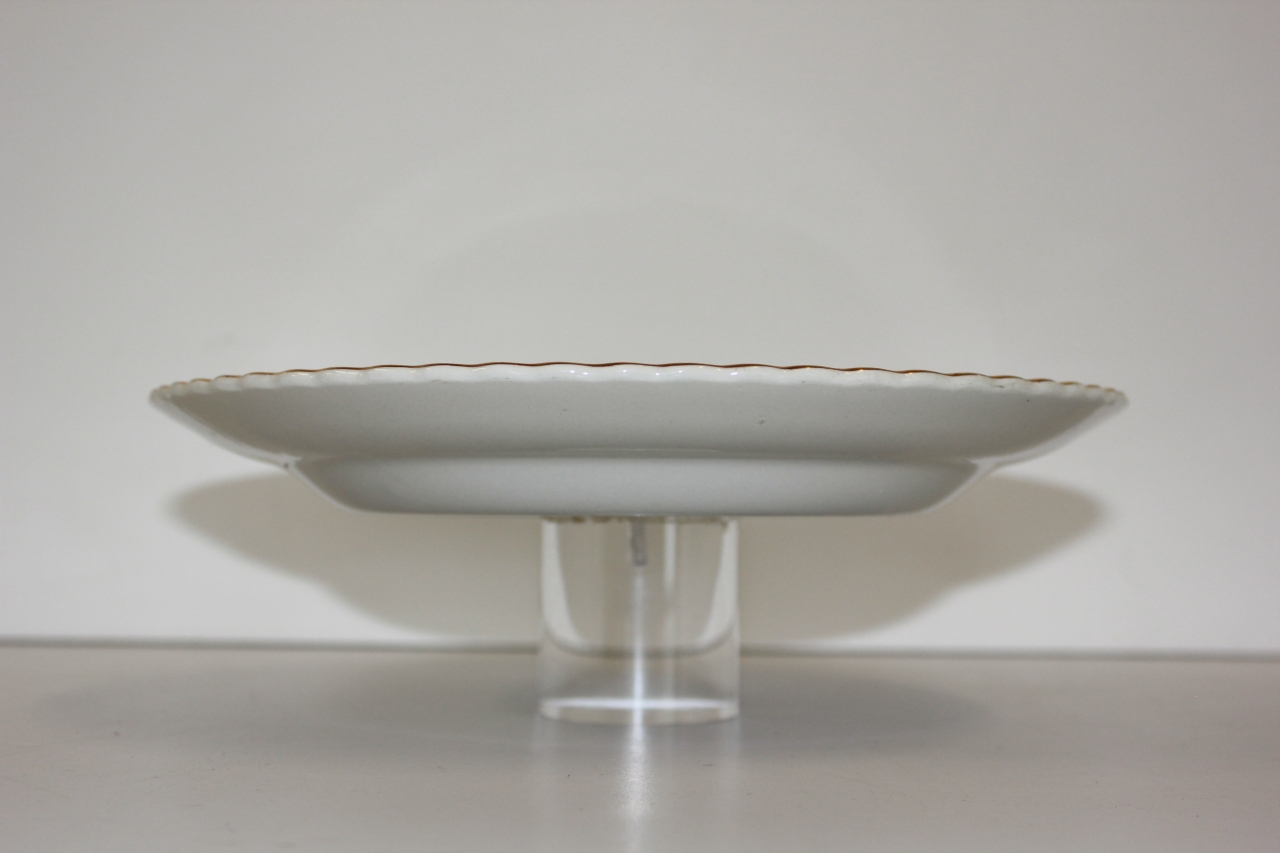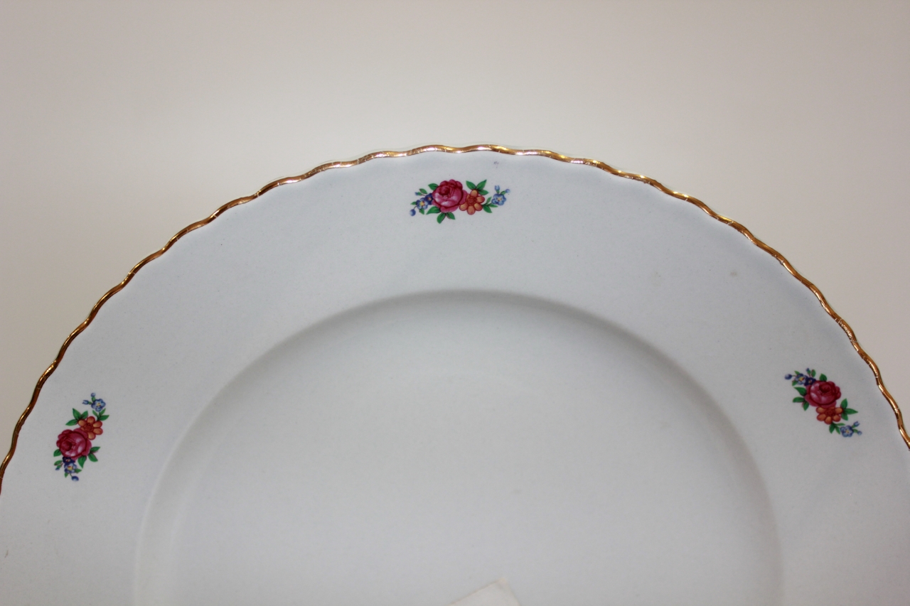 Piatto piano in ceramica modellata e decorata. Bordo lobato, ala liscia. Fondo bianco, ala decorata con sei piccole decalcomanie raffiguranti composizioni floreali con roselline, orlo filettato in oro