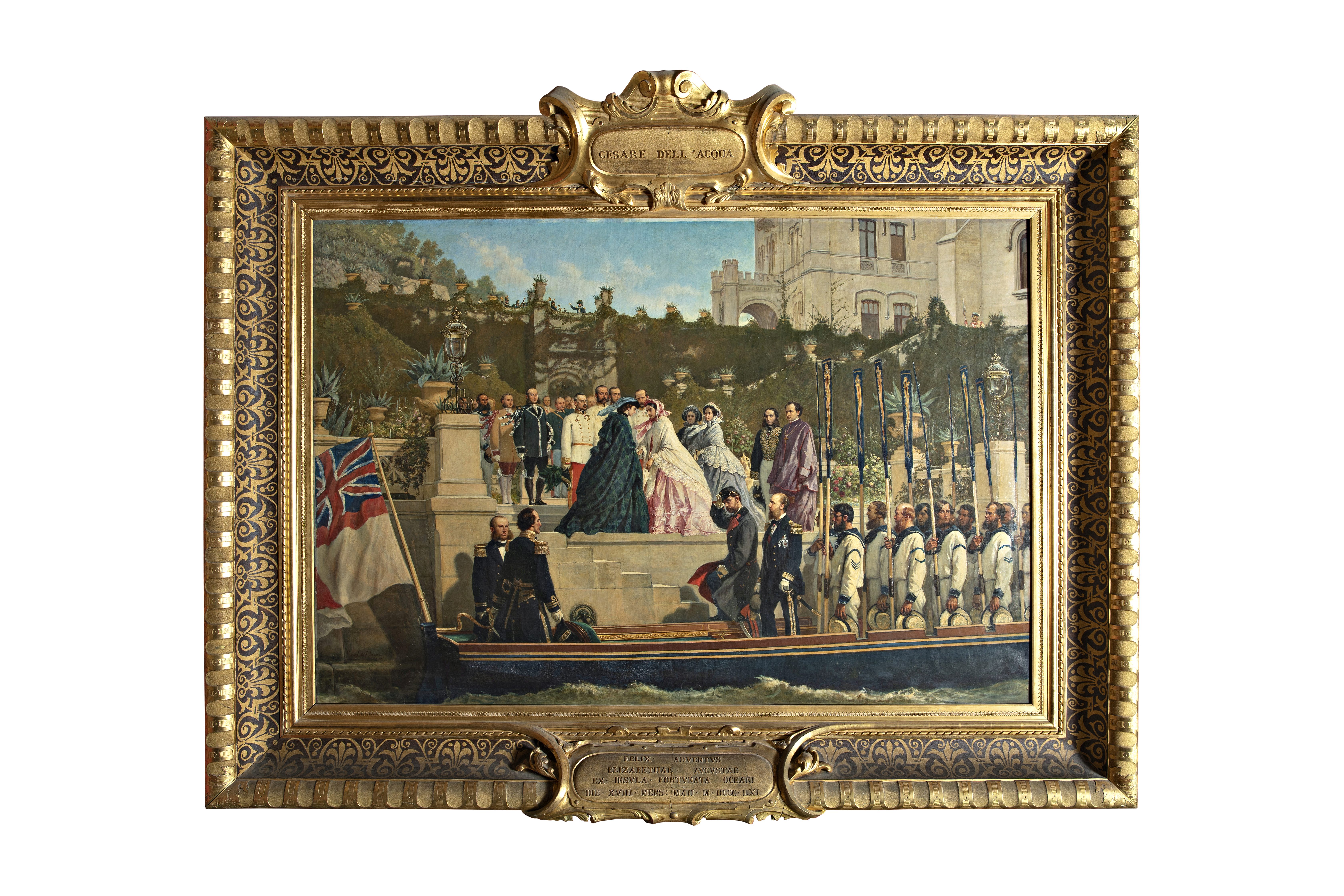 - NOTIZIE STORICO CRITICHE Il quadro raffigura l'arrivo a Trieste, il 18 maggio 1861, dell'imperatrice Elisabetta d'Austria, di ritorno dall'isola di Madera. Ad accogliere l'imperatrice nel porticciolo del Castello di Miramare fu la cognata Carlotta del Belgio. Il 29 settembre 1863 Cesare Dell'Acqua era ospite presso Ferdinando Massimiliano, dal quale aveva ricevuto l'incarico di dipingere il ricevimento della Deputazione Messicana e di eseguire "un bozzetto dell’episodio dell’arrivo a Miramare dell’imperatrice reduce da Madera il 18 maggio 1861", come si evince dal Diario di corte del 1863. Il dipinto fu commissionato ufficialmente dall’arciduca tramite lettera dell’amministratore Radonetz, inviata al pittore il 18 dicembre 1864. Dell’Acqua, che non assistette personalmente all’avvenimento, si documentò per ritrarre tutti i personaggi intervenuti realmente all’incontro e, in una lettera datata 24 dicembre 1864, chiese allo storico Pietro Kandler di ricevere al più presto l’iscrizione da apporre sul dipinto con "l’approdo dell’imperatrice Elisabetta a Miramar". L’opera fu pagata al pittore complessivamente 7.000 franchi ma tale importo, come testimoniato dalla corrispondenza del 1868, fu corrisposto all’artista in due momenti diversi nel 1865. Spedita da Bruxelles il 7 novembre 1865, l’opera comparve alla Prima Esposizione della Società di Belle Arti tenutasi a Trieste nel 1870, come risulta dalla corrispondenza dell’amministratore Stepanek, relativa a quell’anno. Nel catalogo dell’Esposizione la tela figura al numero 180 e, come per gli altri dipinti storici di Dell’Acqua appartenuti all’arciduca, porta la dicitura "non vendibile". Della tela esiste un bozzetto preparatorio ad acquerello conservato nei depositi del Museo Storico del Castello di Miramare (inv. AB55007 - 06/00181046). La scena del bozzetto, per quanto riguarda l’impaginazione, rimarrà per lo più la stessa nella versione a olio. Solo il primo piano viene leggermente ampliato nel quadro finale che accoglie un numero maggiore di marinai, con il remo sollevato, e interamente la scialuppa che esibisce la bandiera inglese. Il pittore inoltre dimostra una gran capacità nel restituire precisamente con pochi tocchi di pennello un sito, quale il porticciolo del castello, e nel "sintetizzare fedelmente i diversi particolari e, in special modo, i tratti fisionomici" dei personaggi