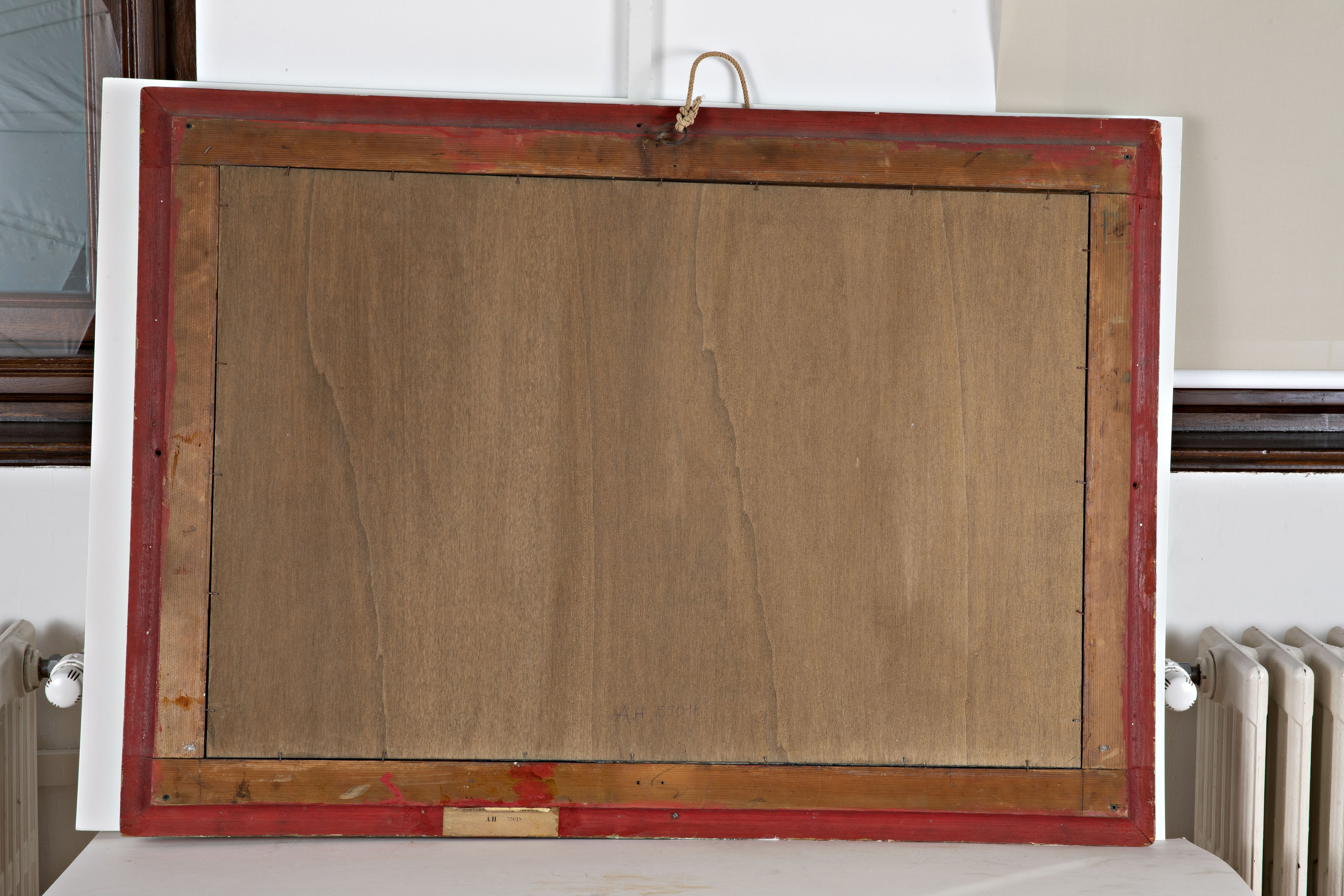 - NOTIZIE STORICO CRITICHE L'opera, assieme ad altri tre quadri con scritte arabe (AH55015; AH55016; AH55017), decorava originariamente la sala moresca di villa Lazarovich, prima residenza triestina dell'arciduca Ferdinando Massimiliano d’Asburgo a Trieste. Nel 1852 Massimiliano decise di risiedere stabilmente a Trieste e affittò una villa con un vasto giardino sul colle di San Vito, edificio che in seguito restaurò e adattò alle sue esigenze. Presumibilmente, può essere ascritta al 1854 la decorazione interna ad opera di maestranze locali. Al primo piano, in sintonia con le tendenze artistiche del tempo, l’arciduca fece decorare una stanza e parte del corridoio in stile orientale o moresco. Fu soprattutto il viaggio in Turchia, compiuto nel 1850, a ravvivare l’entusiasmo e la passione di Ferdinando Massimiliano per l’Oriente e a influire sulla sua vivida immaginazione tanto da spingerlo a voler ricreare a nelle sue residenze quegli ambienti esotici che egli aveva conosciuto a Smirne. La sala, come testimoniato dalle vedute di Germano Prosdocimi, realizzate intorno al 1855, era caratterizzata da porte a forma di toppa, da una fontana con piante acquatiche, dal soffitto con al centro un lucernario con scritte in caratteri arabi e da una serie di arredi e oggetti, alcuni dei quali conservati tutt’oggi nelle sale e nei depositi di Miramare, come ad esempio trofei di armi turche, tappeti, sgabelli e uova di struzzo e le scritte arabe incorniciate e appese sulle pareti della sala. Nella tempera di Prosdocimi raffigurante il “Salotto orientale di villa Lazarovich con scena di conversazione” si riconosce un quadro con scritta in arabo, appeso sulla parete destra. La tempera di Prosdocimi rivela, inoltre, che all’epoca i quadri con le scritte in arabo erano sormontati da corna di animali. I quadri, come parte della decorazione a boiseries della sala, furono successivamente smontati e ricollocata al primo piano del castelletto nel parco di Miramare, la seconda dimora triestina dell’arciduca. Una fotografia datata agli anni Trenta del Novecento testimonia che all'epoca l'opera era appesa a una delle pareti del salotto orientale del Castelletto