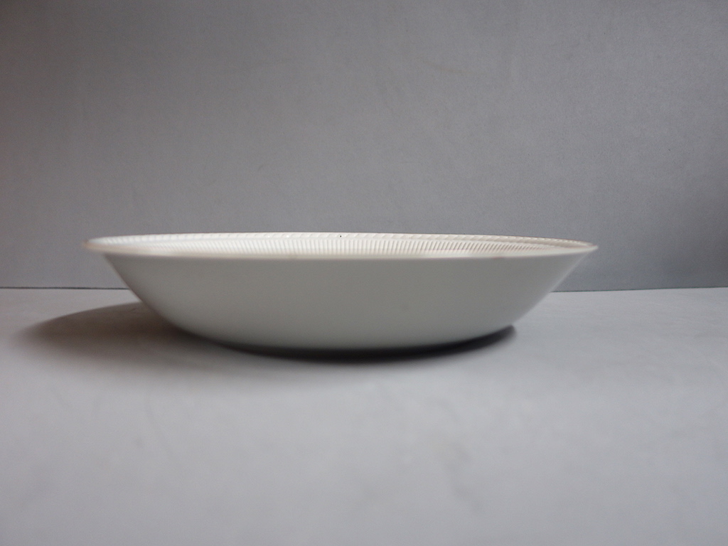 Piatto fondo a forma di calotta in ceramica e decorata e modellata. Orlo liscio filettato in oro e ala decorata nel bordo e al limitare del cavetto con motivo a rilievo a cordoncino e modellata a rilievo a millerighe. Fondo con al centro del cavetto grande decalcomania di frutta. Etichetta con scritta Calotta [...] / cm 23