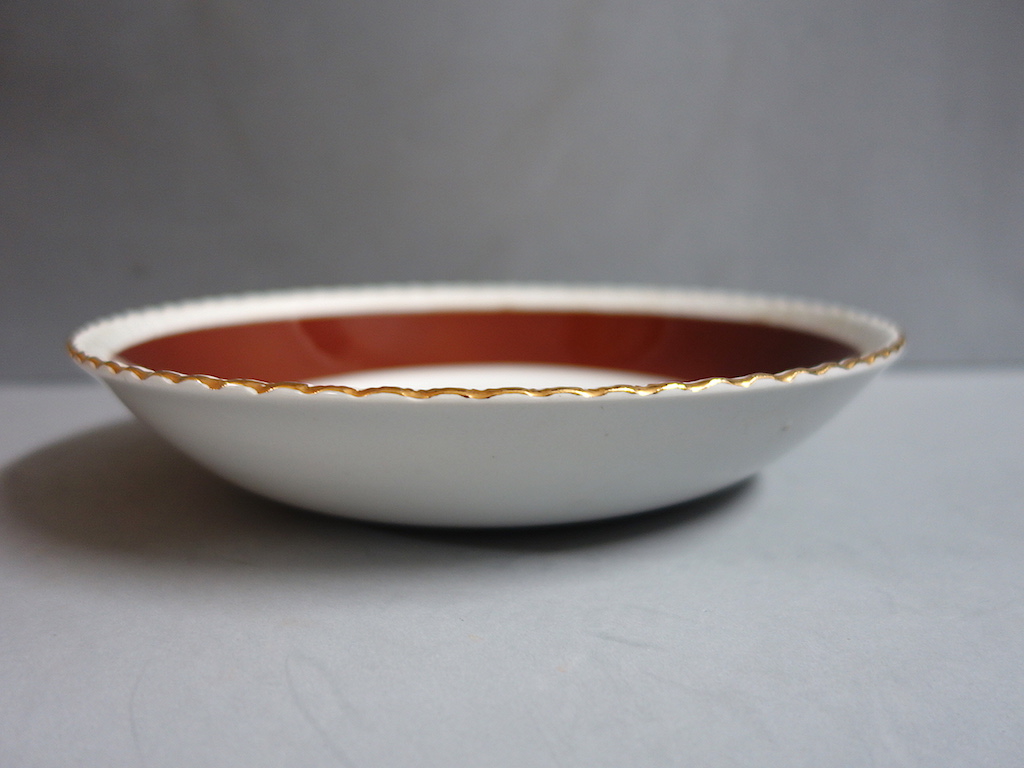 Piatto fondo a forma di calotta in ceramica e decorata e modellata. Orlo sagomato filettato in oro. Bordo decorato a rilievo con motivo a fiamma, fascia di colore rosso. Fondo con decorazione al centro del cavetto tonda di colore rosso e timbrata con motivo a mandala dorato