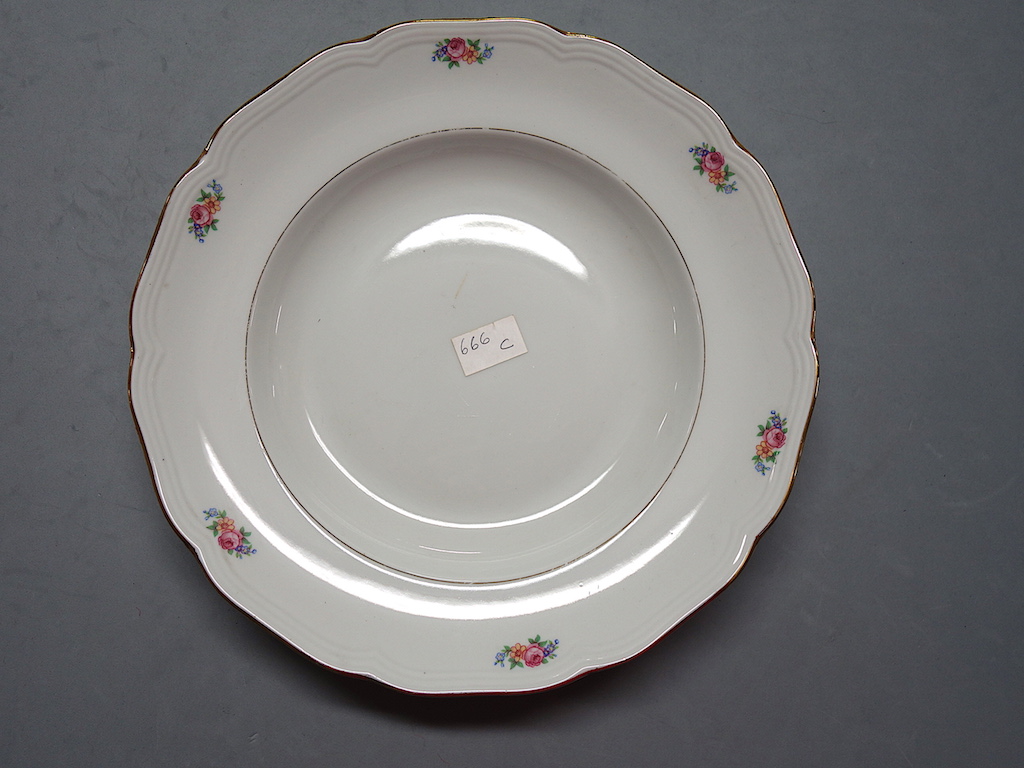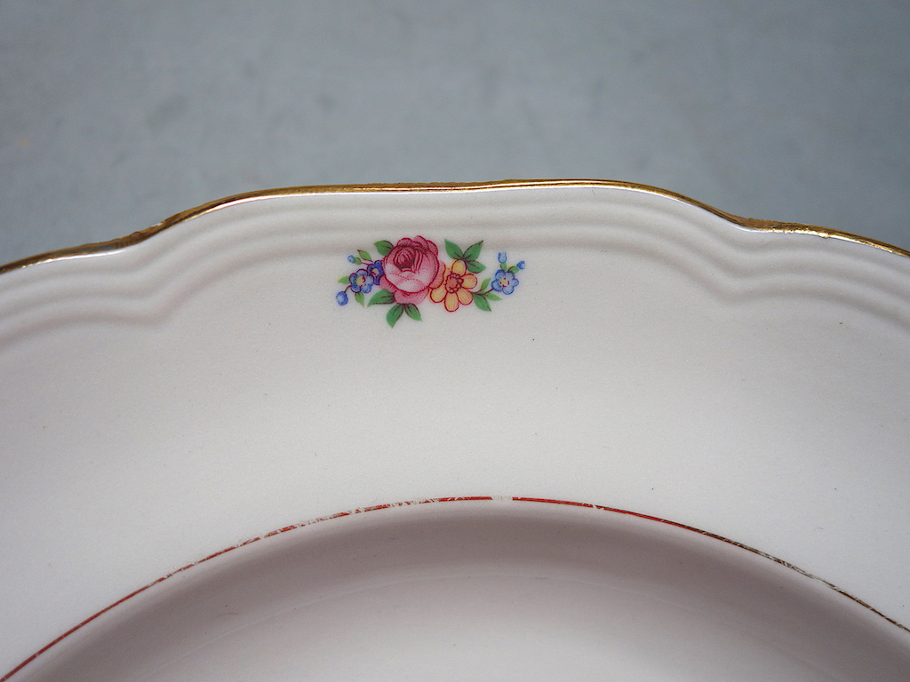 Piatto piano in porcellana modellata e decorata. Orlo sagomato filettato in oro. Ala sagomata bianca con triplo bordo in rilievo limitata al cavetto con filo in oro e 6 decorazioni floreali a decalcomania (roselline). Fondo bianco