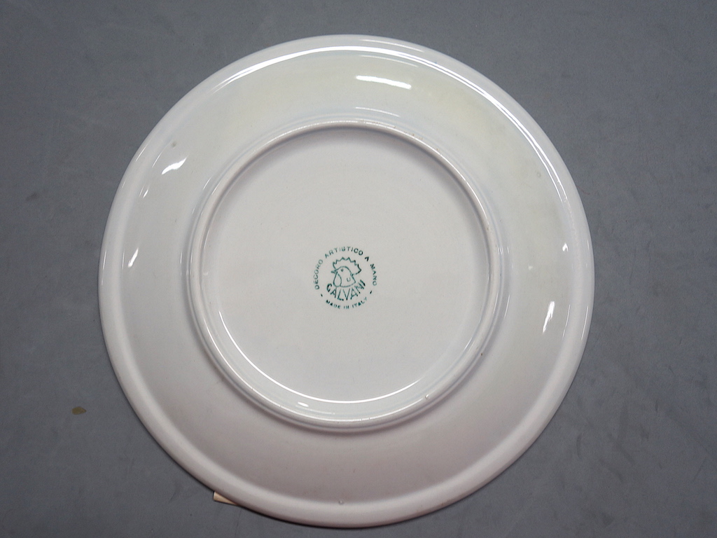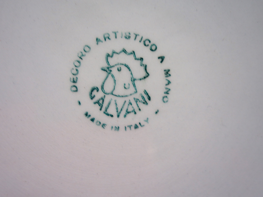 - STEMMI sotto alla base - di fabbrica - Marchio - Ceramiche Galvani - 1 - testa di gallo sopra scritta GALVANI ed entro scritta circolare DECORO ARTISTICO A MANO/ MADE IN ITALY; timbro