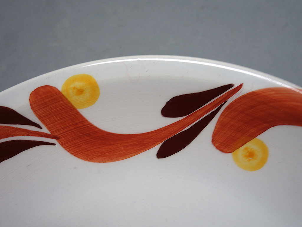 Piatto piano in ceramica modellata e decorata. Orlo liscio. Ala decorata mano con motivo a foglie stilizzate marroni e arancio e pallini gialli. Fondo bianco