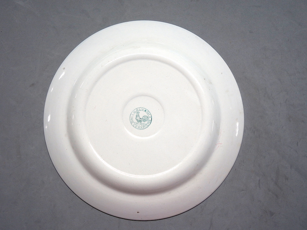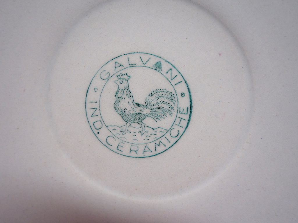 - STEMMI sotto alla base - di fabbrica - Marchio - Ceramiche Galvani - 1 - gallo andante entro corona circolare con la scritta GALVANI/ IND. CERAMICHE; timbro