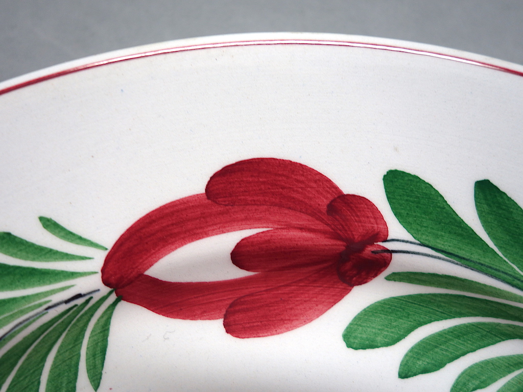 Piatto piano in ceramica modellata e decorata. Orlo liscio. Bordo filettato marrone. Ala decorata al limite del cavetto a mano con motivo floreale a seguire stilizzato con fiori rossi e blu alternati. Fondo bianco