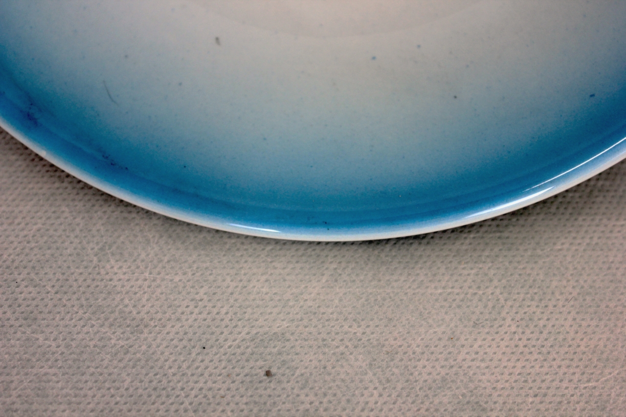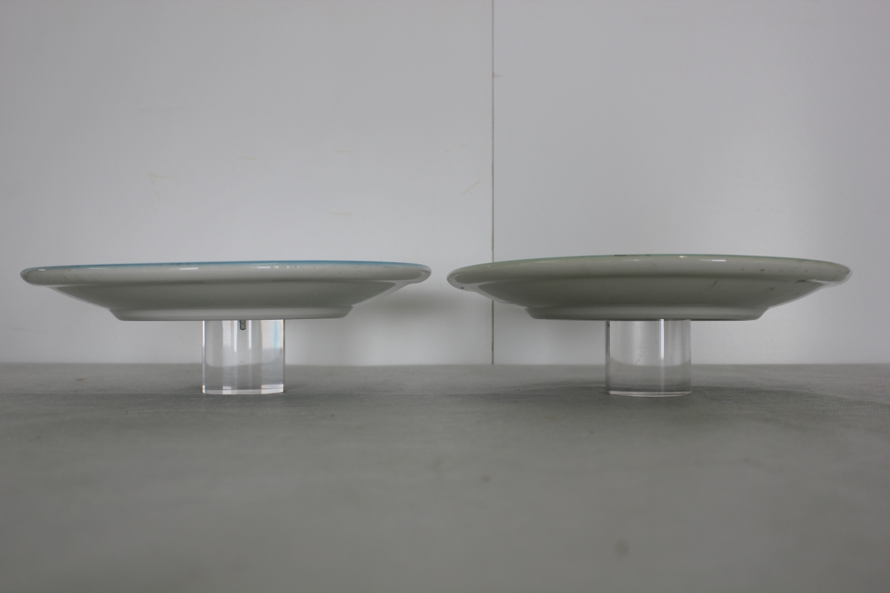 Coppia di piatti piani in ceramica modellata e dipinta. Fondo bianco, decoro sfumato all'aerografo nelle tonalità dell'azzurro (piatto M) e del verde (piatto N)