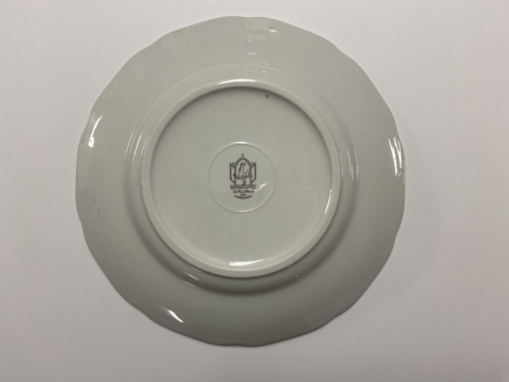Piatto da frutta o da dolce. Ala lobata, con bordo in rilievo, filettata in oro all'orlo e al cavetto e decoro floreale; policromo su fondo bianco. Sul retro marchio di fabbrica timbrato