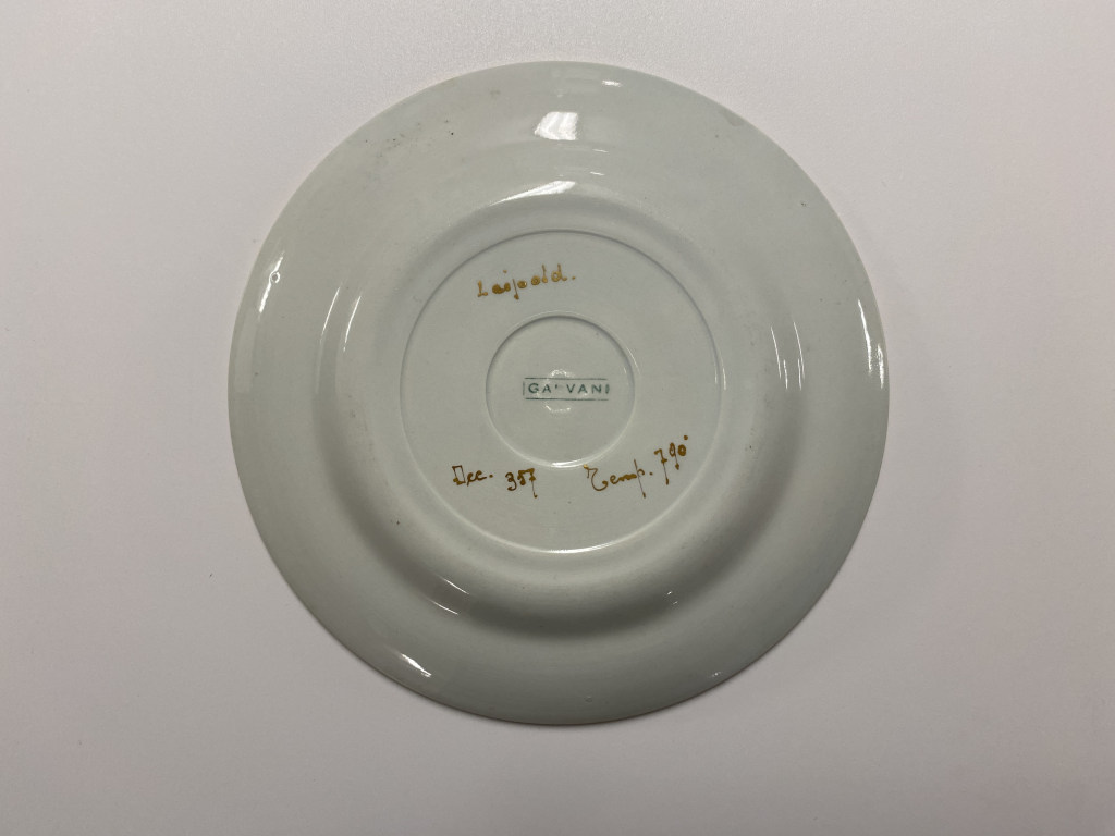 Piatto da frutta o da dolce. Ala fasciata in oro. Decoro floreale al centro del cavetto: rosa e bocciolo; policromo su fondo bianco. Sul retro marchio di fabbrica timbrato