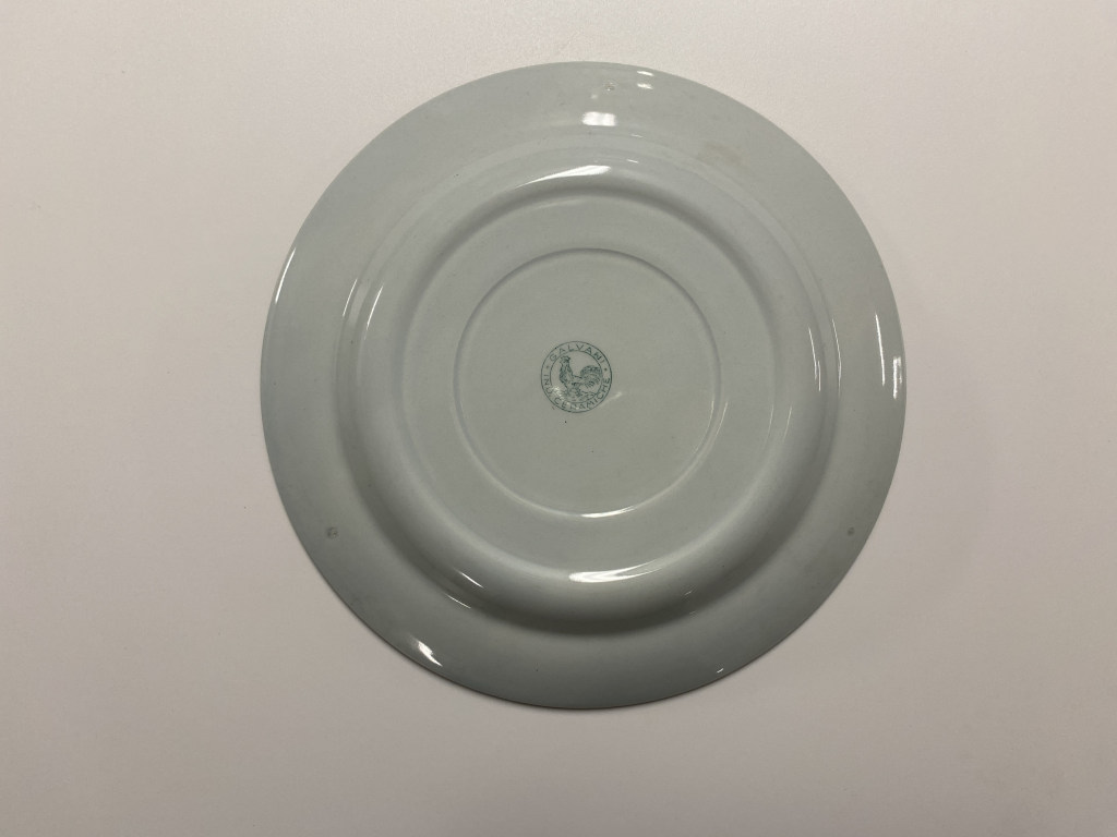 Piatto con orlo filettato e decoro floreale a pennello e tampone tra cavetto e ala; policromo su fondo bianco. Sul retro marchio di fabbrica timbrato