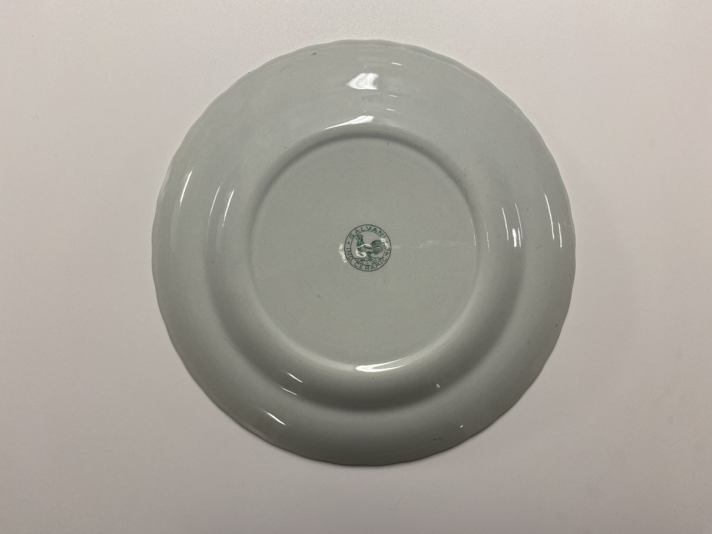 Ala in rilievo con orlo smerlato, bordo zigrinato e decoro geometrico; fasciato in celeste su fondo bianco. Sul retro marchio di fabbrica timbrato