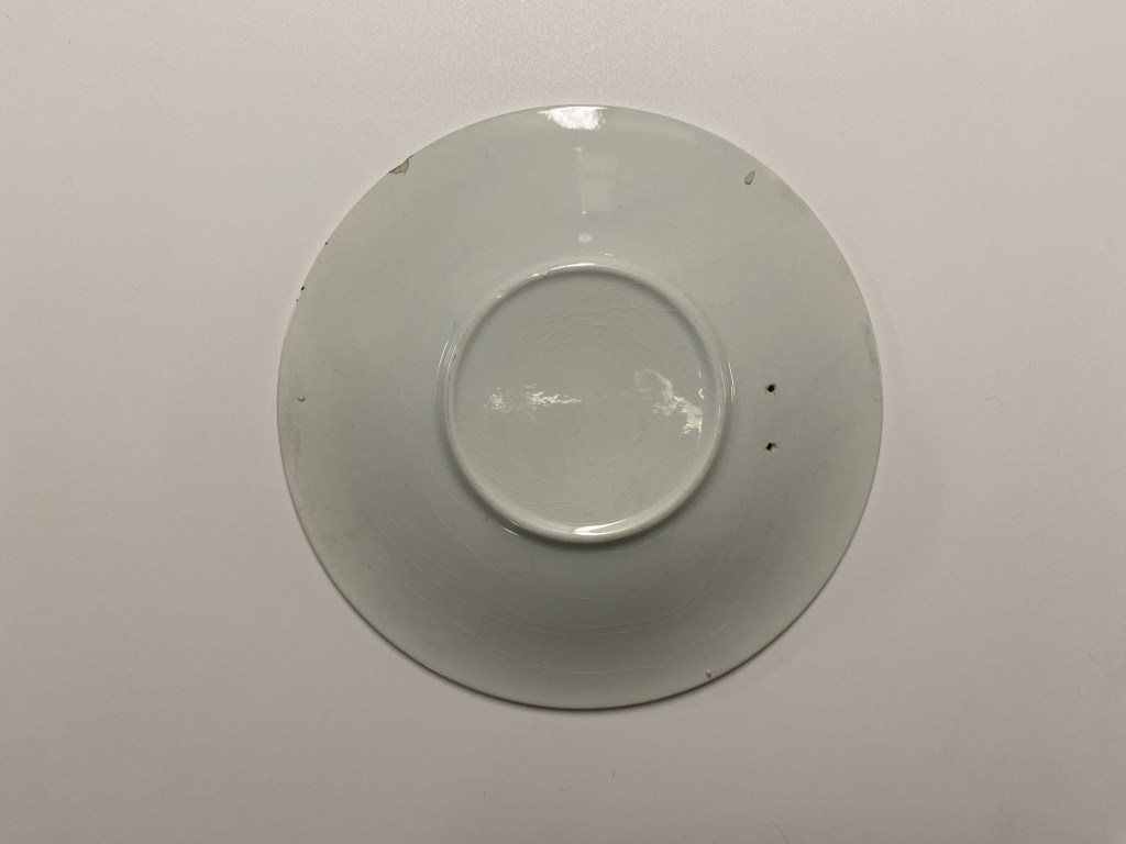 Piatto da frutta o da dolce. Decoro totale a rete, con tre mezze corolle di petali lanceolati sul bordo; in celeste e rosso su fondo bianco