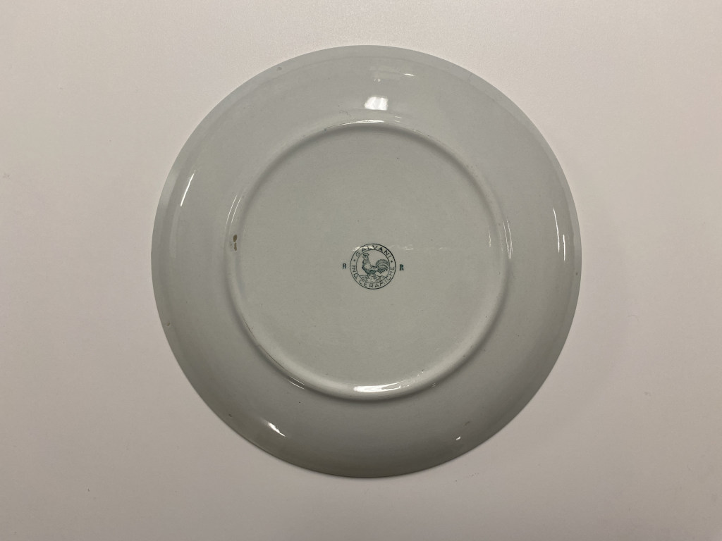 Piatto con bordo filettato e ala iscritta. Decoro geometrico a forma di stella nel cavetto; in blu su fondo bianco. Sul retro marchio di fabbrica timbrato