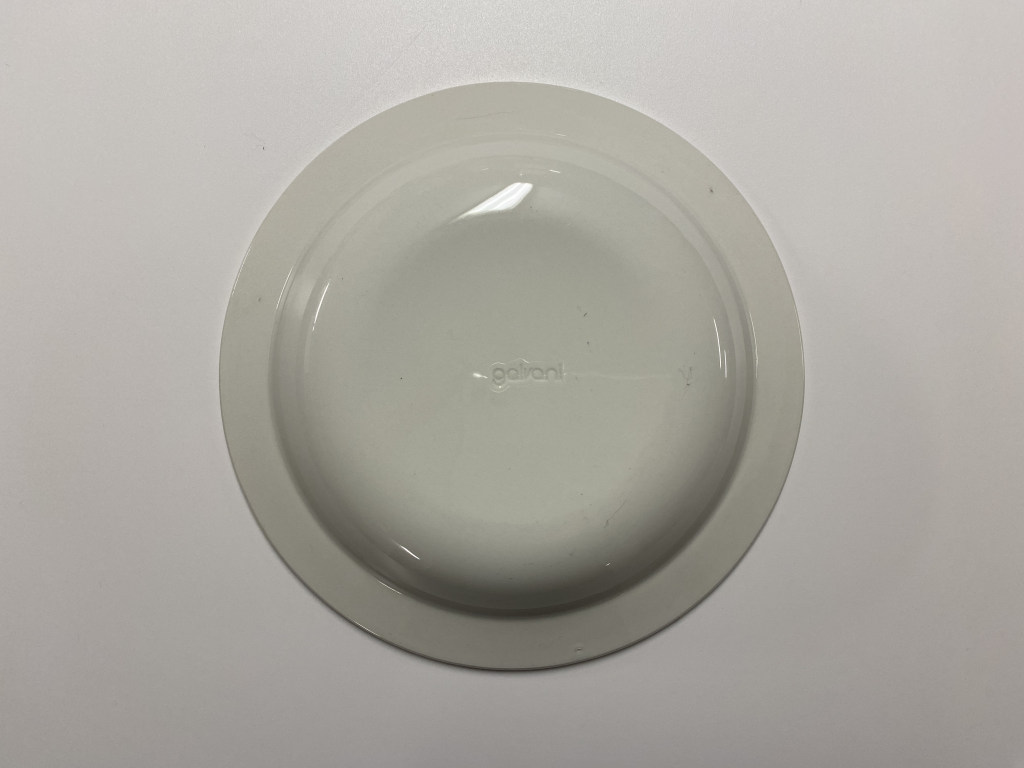 Piatto con doppia filettatura alternata; in rosso e marrone su fondo bianco. Sul retro marchio di fabbrica impresso