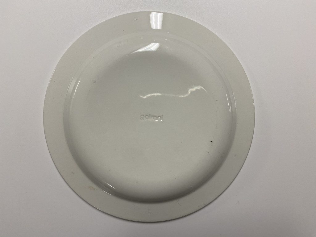 Piatto con doppia filettatura alternata; in rosso e marrone su fondo bianco. Sul retro marchio di fabbrica impresso