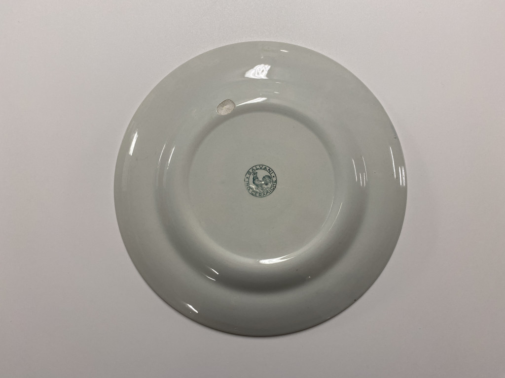 Piatto con ala in rilievo a raggiera e mezze corolle; in verde chiaro su fondo bianco. Sul retro marchio di fabbrica timbrato